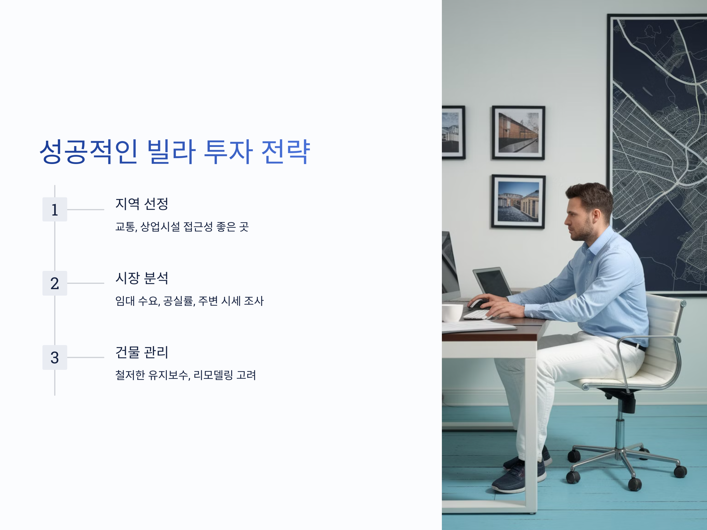 빌라의 상태와 관리가 중요한 요소입니다. 건물이 오래된 경우 리모델링을 고려해야 할 수 있으며, 관리 상태가 좋지 않으면 임대 수익이 떨어질 수 있습니다. 철저한 관리가 수익에 큰 영향을 미치므로, 관리비와 수리비용도 사전에 고려해야 합니다.