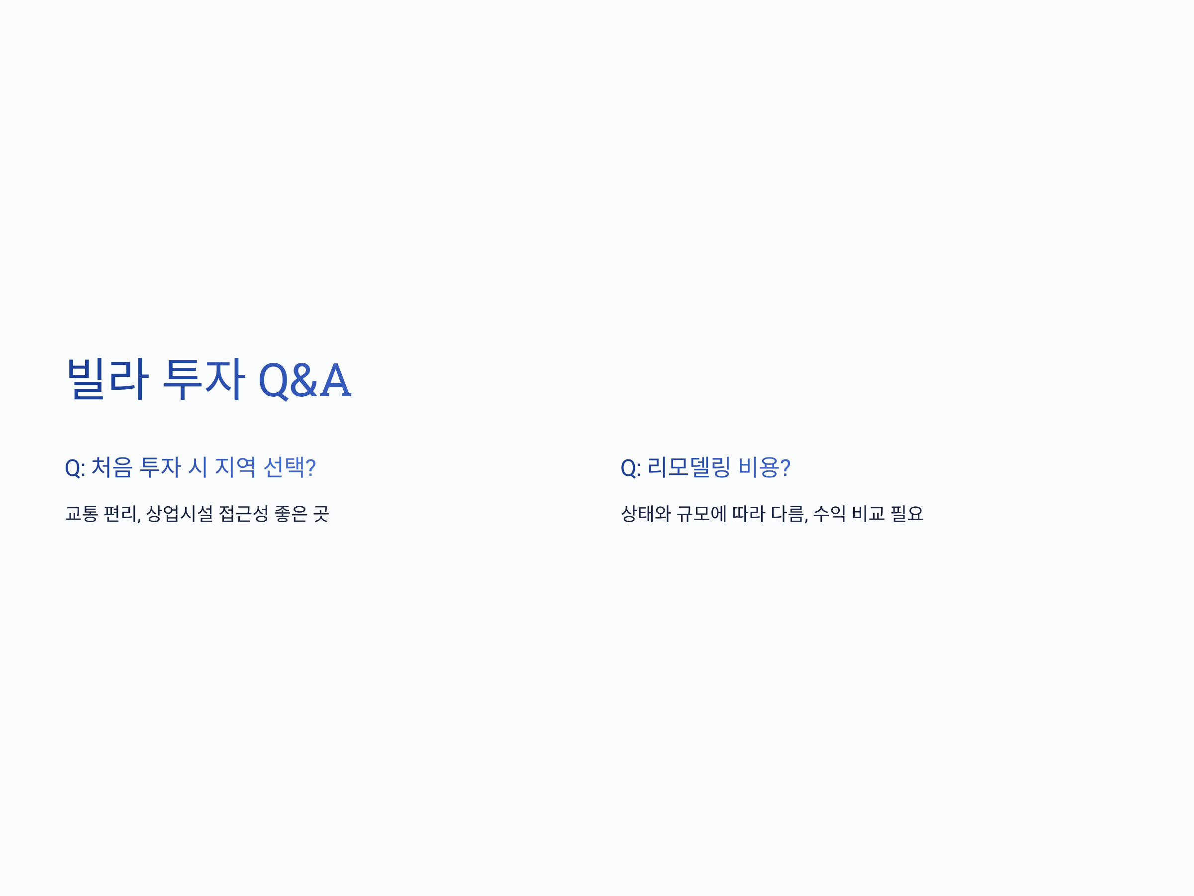 A: 빌라 투자를 고려할 때는 교통이 편리하고, 상업시설과의 접근성이 좋은 지역을 선택하는 것이 좋습니다. 예를 들어, 서울이나 수도권의 중심지와 가까운 지역이나 대중교통이 잘 연결된 곳을 선택하면 안정적인 수익을 기대할 수 있습니다.