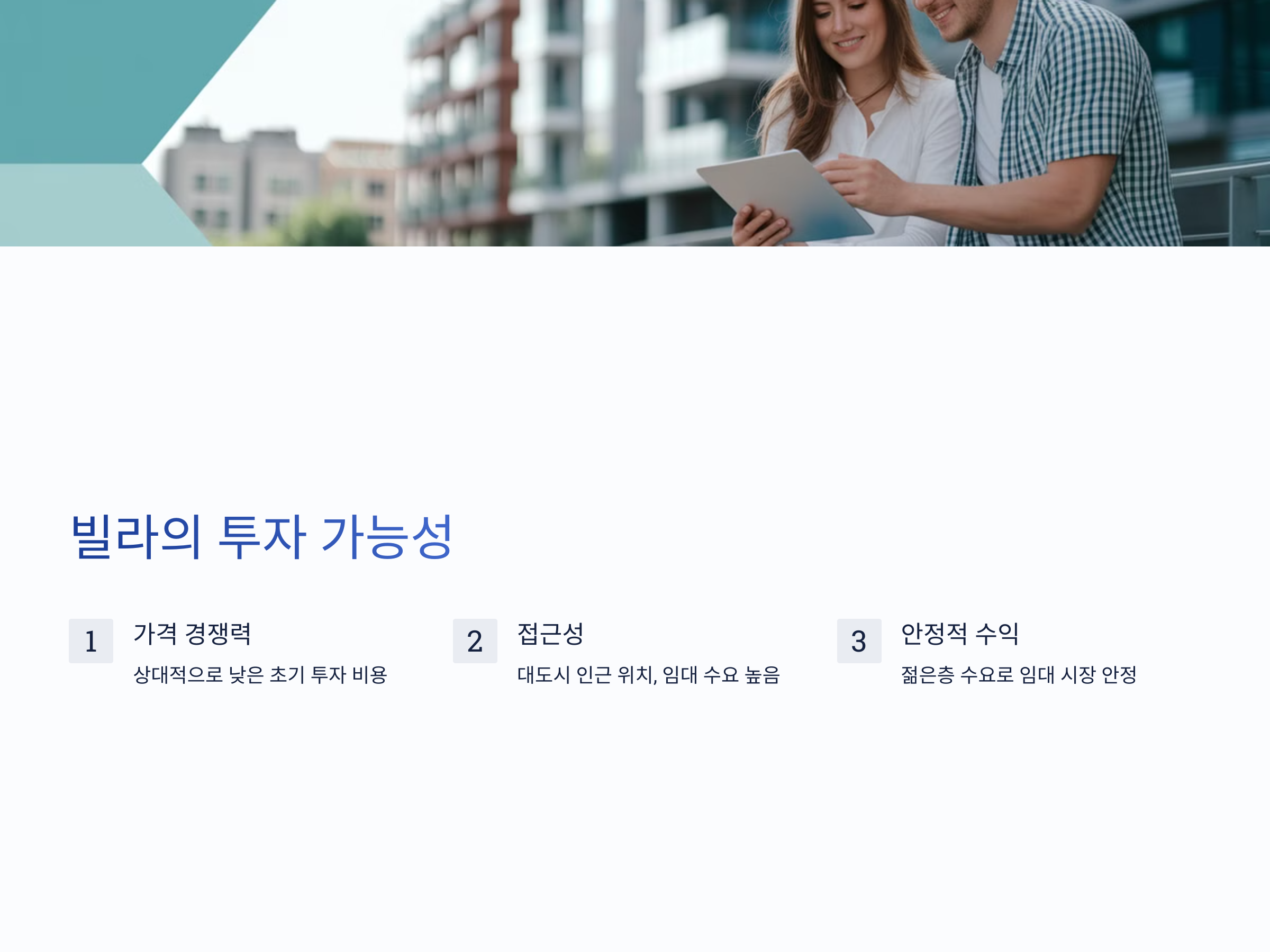 빌라가 수익형 부동산으로 주목받는 이유는 무엇일까요? 첫 번째 이유는 상대적으로 가격이 낮고, 접근성이 좋다는 점입니다. 대도시 인근의 빌라는 적당한 가격에 임대 수익을 기대할 수 있는 장점이 있습니다. 특히, 서울이나 수도권에서는 젊은층의 수요가 많아 임대 시장에서 안정적인 수익을 낼 수 있습니다.