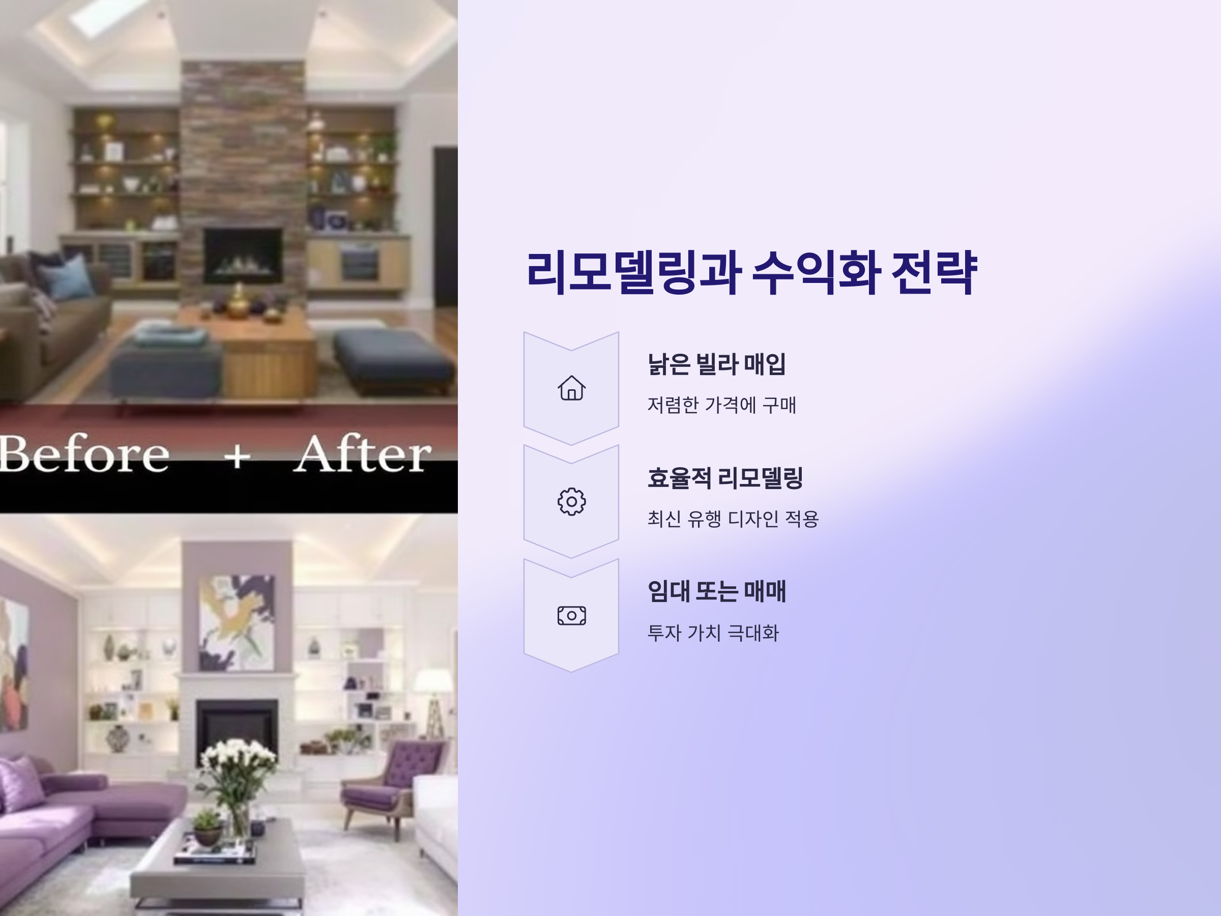 리모델링은 빌라 투자에서 중요한 수익화 방법 중 하나입니다. 많은 투자자들이 건축적인 개선을 통해 빌라의 가치를 높이는 전략을 취합니다. 예를 들어, 낡은 빌라를 새롭게 단장하여 임대용으로 전환하거나, 매매를 목적으로 리모델링을 합니다. 리모델링을 통해 공간을 효율적으로 재구성하고, 최신 유행을 반영한 디자인으로 투자 가치를 극대화할 수 있습니다.