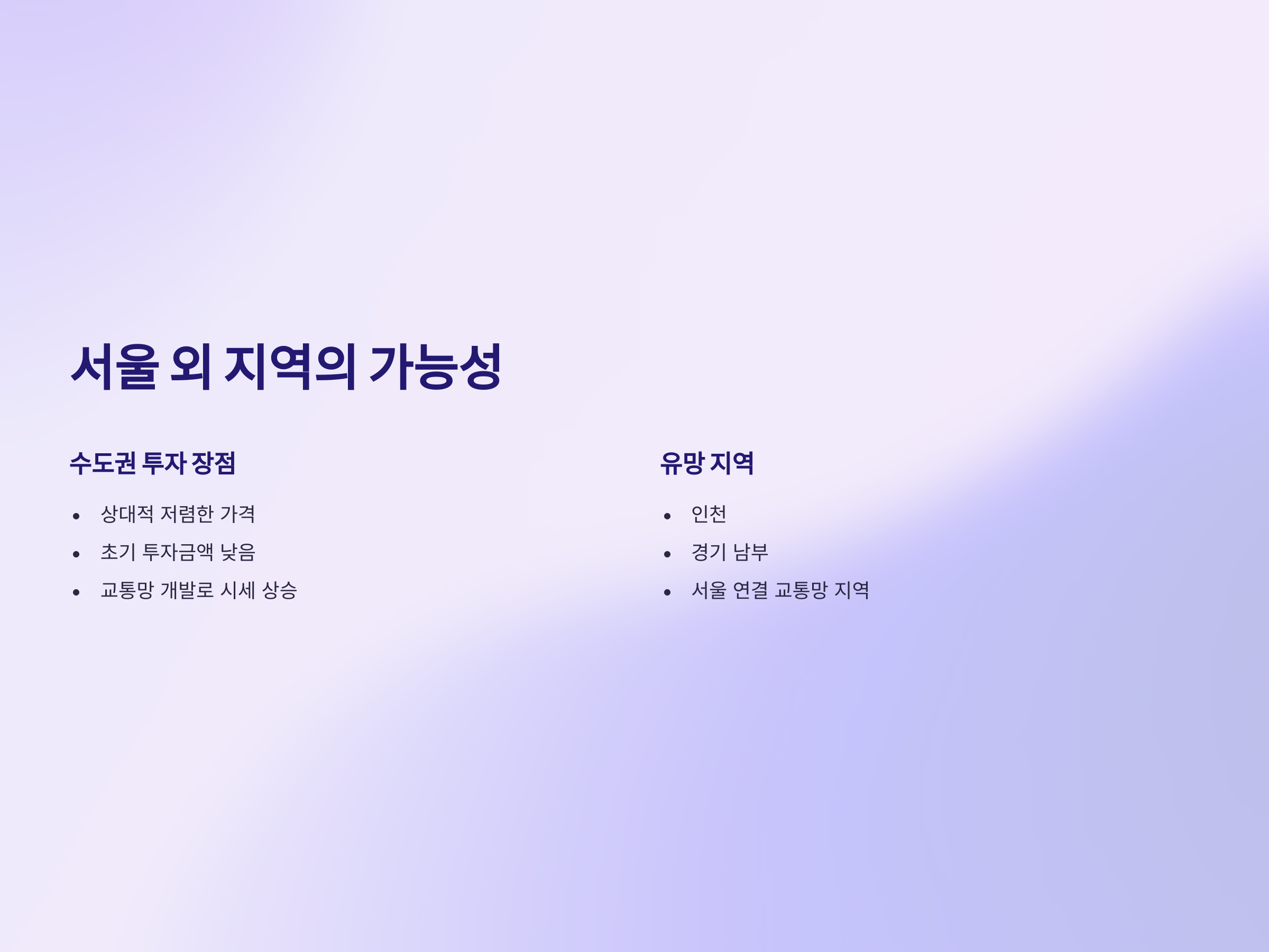 이러한 지역들은 서울과 비교했을 때 상대적으로 더 저렴한 가격으로 시작할 수 있기 때문에 초기 투자금액을 낮출 수 있는 장점이 있습니다. 또한, 서울과 연결되는 교통망이 개선되면서, 서울 근처에 위치한 지역들은 수요가 점차 증가하고 있습니다. 이를 통해 장기적인 시세 상승을 기대할 수 있습니다.