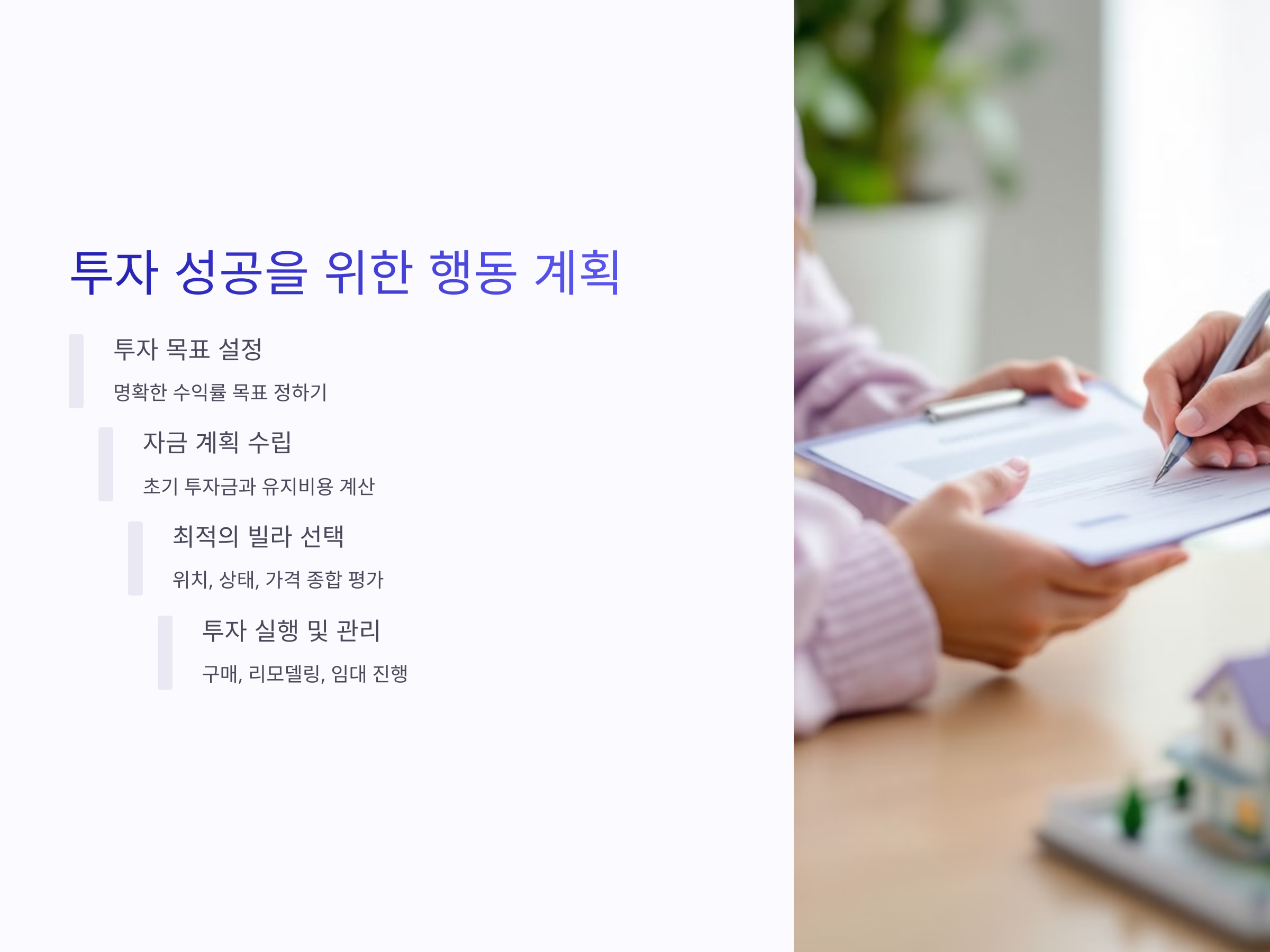 빌라 투자는 적절한 전략과 철저한 시장 분석이 뒷받침될 때 안정적인 수익을 낼 수 있는 좋은 방법입니다. 빌라를 선택할 때는 위치, 가격, 리모델링 가능성, 관리 등 다양한 요소를 고려해야 합니다. 또한, 리스크를 최소화하고, 안정적인 임대 수익을 얻기 위한 노력이 필요합니다.