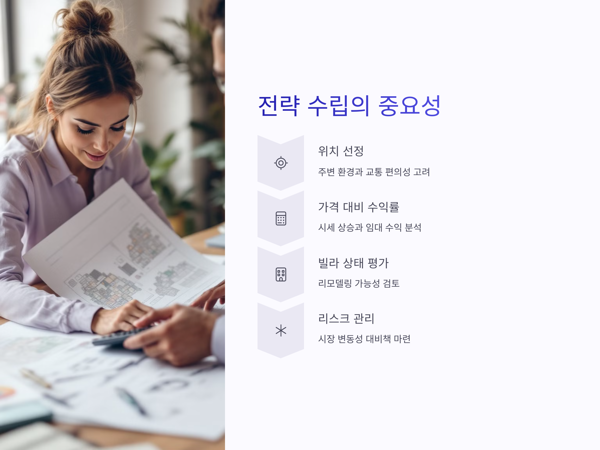 빌라 투자의 성공 여부는 바로 전략에 달려 있습니다. 좋은 위치의 빌라를 잘 선택하고, 이를 어떻게 활용할지에 대한 전략적인 계획이 필수적입니다. 단순히 빌라를 구매한다고 해서 좋은 수익을 낼 수 있는 것은 아닙니다. 빌라 투자는 위치, 가격, 리모델링 가능성, 임대 수익 등을 종합적으로 고려하여 전략을 세워야 합니다.
