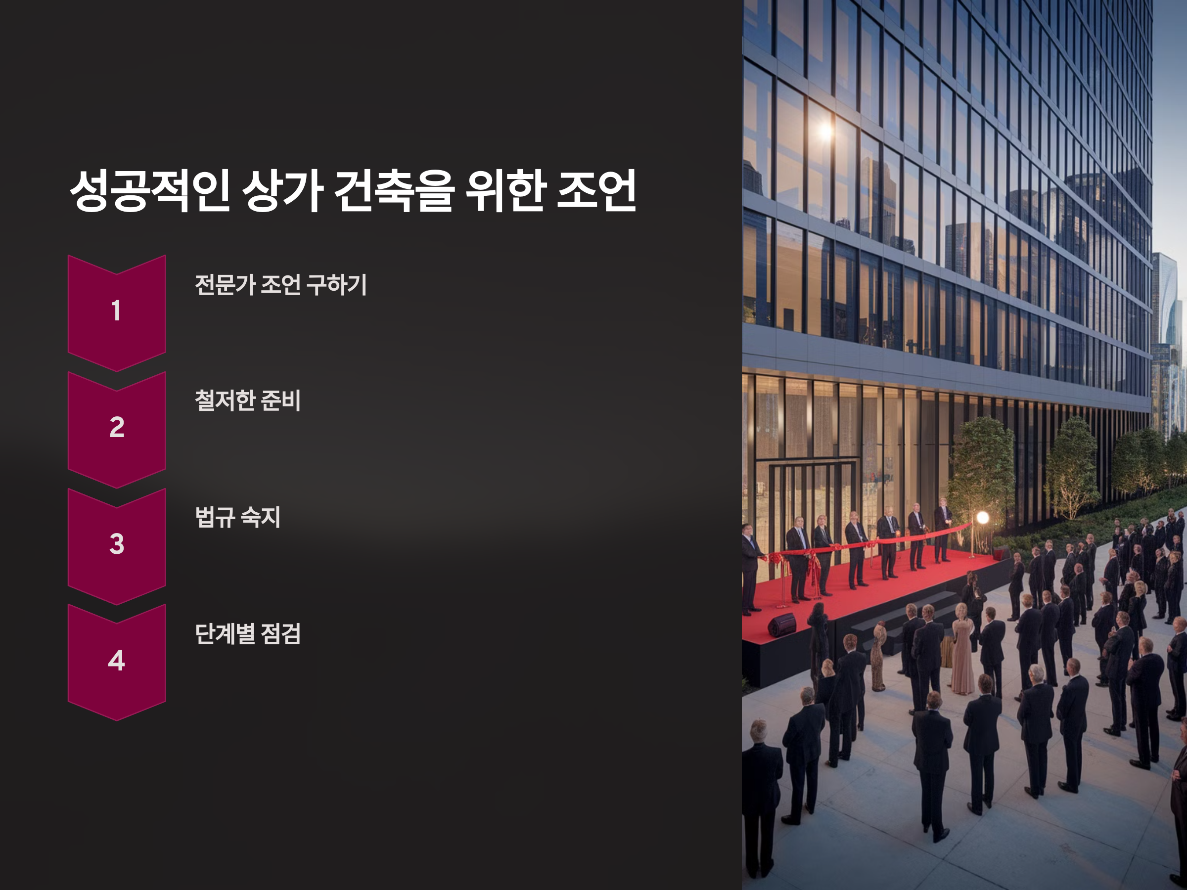 - 건축법규 준수: 상가 건축은 법적 규제를 반드시 따라야 합니다. 건축법, 도시계획법, 환경법 등을 철저히 준수해야 합니다.