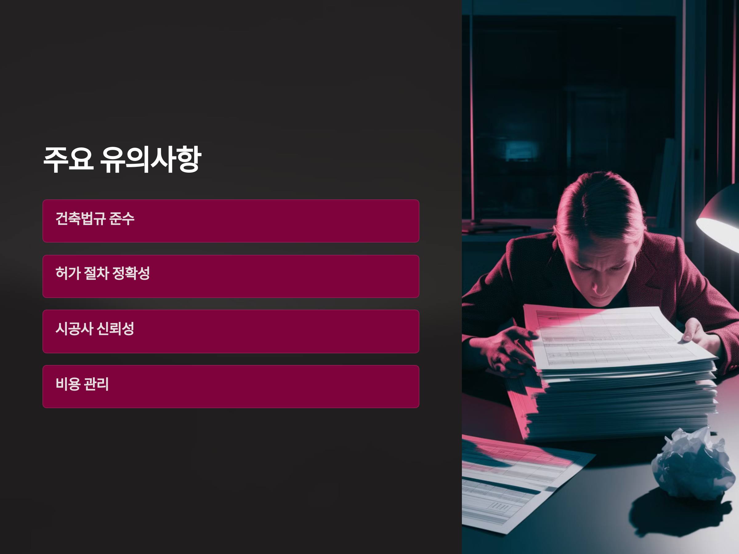 상가 건축을 진행하는 과정에서 몇 가지 중요한 사항을 유의해야 합니다. 이를 놓치면 건축 과정이 지연되거나 불법 건축물로 간주될 수 있습니다.