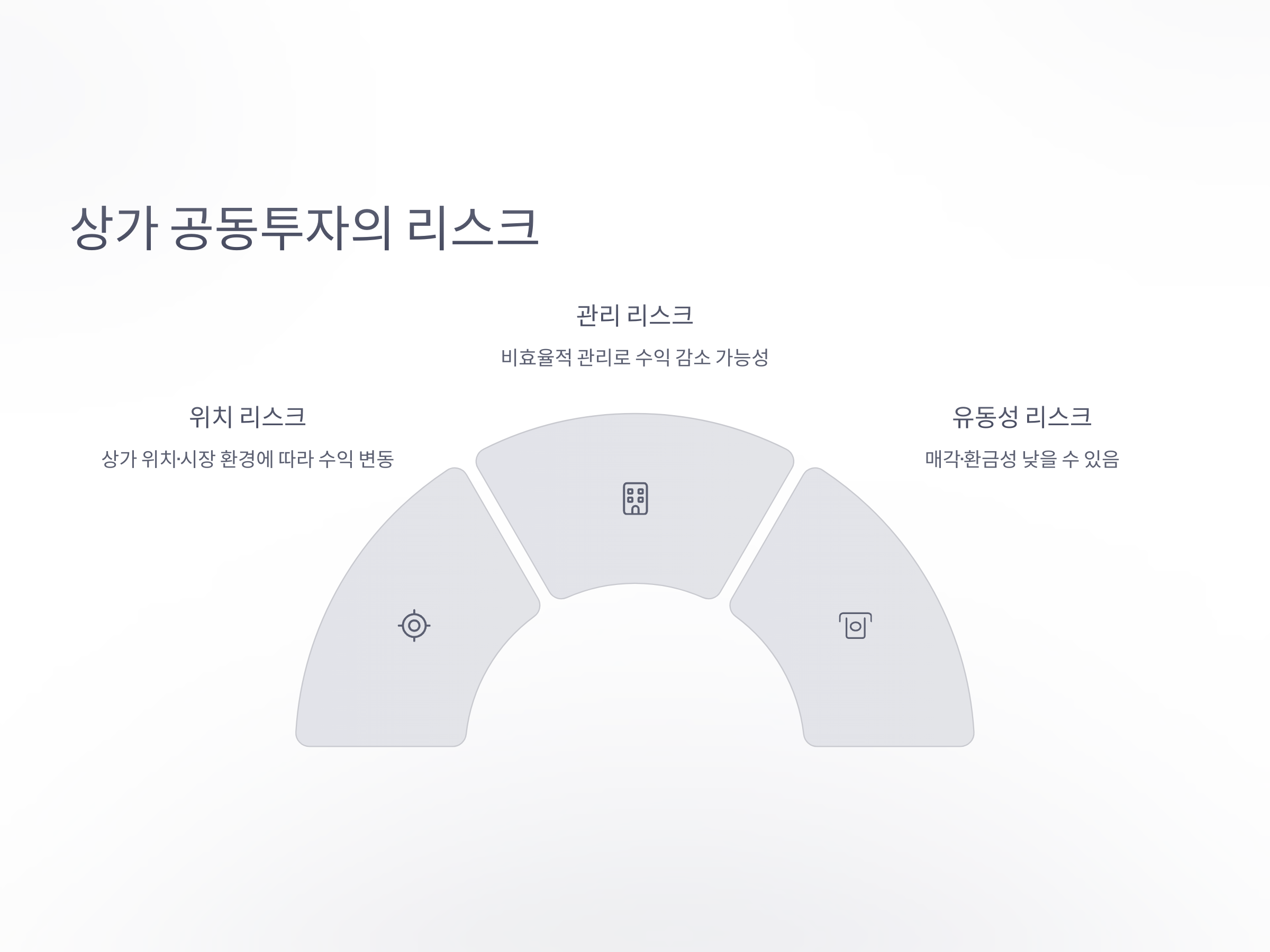 물론 상가 공동투자방식에도 리스크가 존재합니다. 첫째, 상가의 위치나 시장 환경에 따라 수익이 달라질 수 있다는 점입니다. 상가가 위치한 지역의 경제 상황이나 상업적 환경이 변하면 예상보다 낮은 수익을 낼 수도 있습니다. 둘째, 투자자가 관리에 직접 관여하지 않는 경우, 관리 회사의 운영이 원활하지 않거나 비효율적인 관리가 이루어질 경우, 투자자들의 수익에 부정적인 영향을 미칠 수 있습니다.