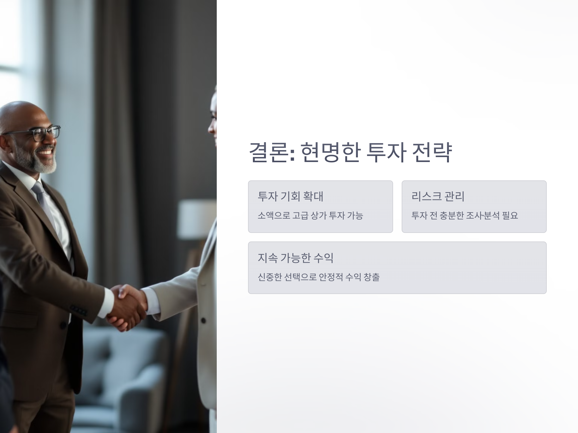 상가 공동투자방식은 여러 투자자들이 힘을 합쳐 자금을 모으고, 상가를 함께 소유하며, 리스크를 분산시키고 수익을 나누는 투자 방법입니다. 이 방식은 큰 자금을 투자하지 않고도 상가에 참여할 수 있는 좋은 기회를 제공하며, 고급 상가나 상업용 부동산에 투자할 수 있는 장점이 있습니다. 또한, 공동투자자는 관리에 대한 부담을 덜고 수익을 얻을 수 있다는 점에서 매우 유리한 방식입니다.