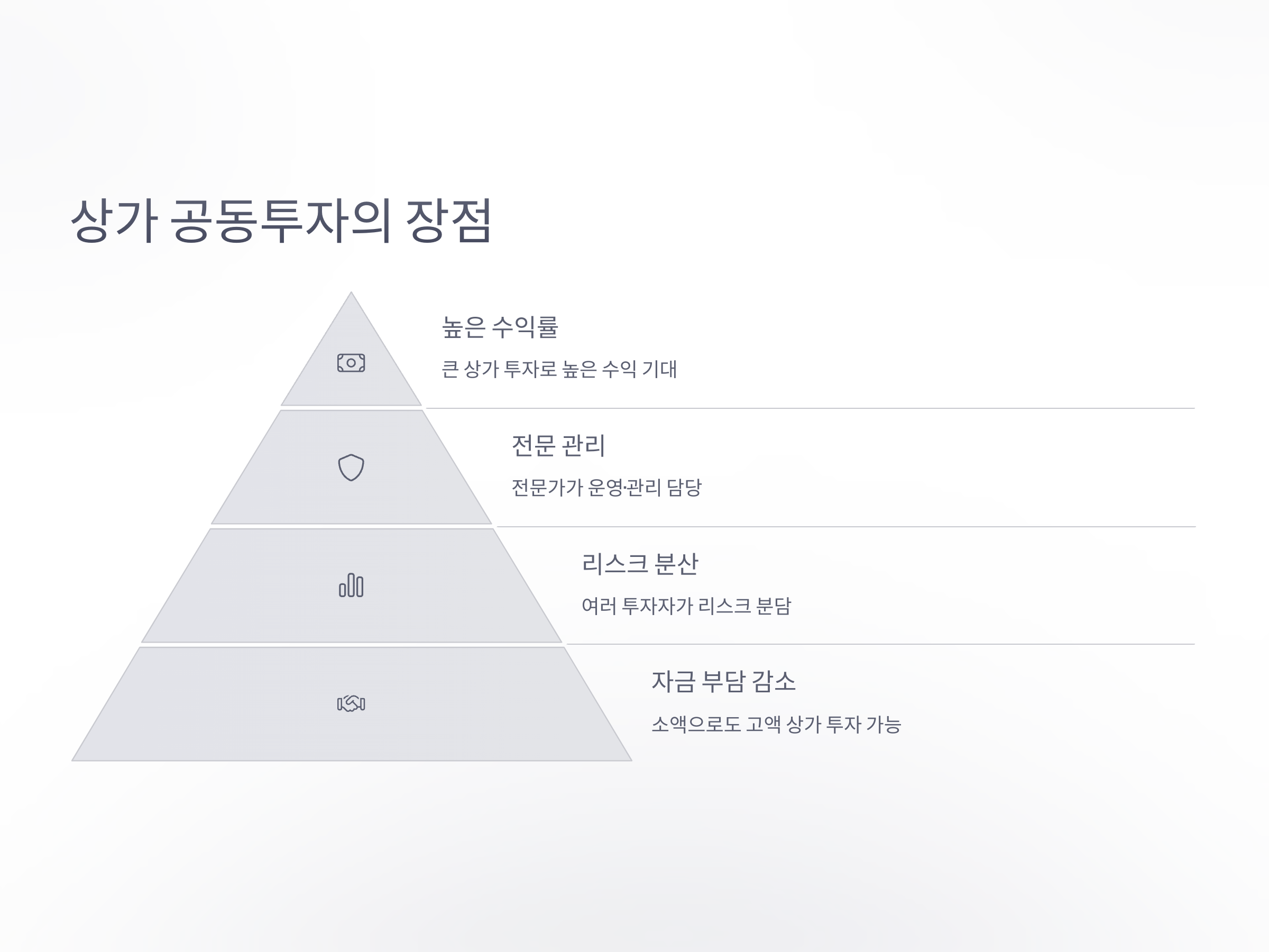이 방식의 장점은 개인 투자자가 혼자서 감당하기 어려운 고액의 상가를 함께 투자함으로써 자금을 분담할 수 있다는 점입니다. 또한, 상가 관리와 운영은 전문 업체나 관리 회사가 맡게 되므로, 투자자는 직접 관리에 부담을 가지지 않고 수익을 얻을 수 있습니다. 이런 형태의 공동 투자 모델은 '부동산 펀드'나 'REITs(Real Estate Investment Trusts)'와 비슷하지만, 상가 공동투자는 좀 더 구체적인 상가에 직접 투자하는 형태라는 차이가 있습니다.