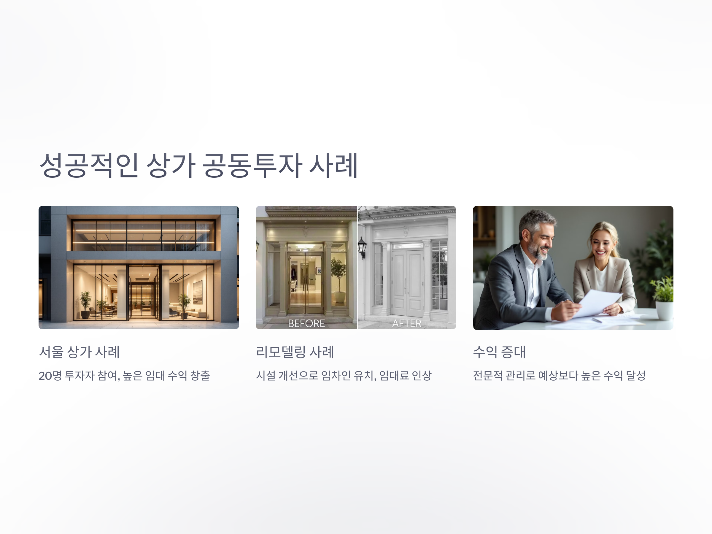 상가 공동투자방식은 이미 많은 사례에서 성공적인 결과를 얻었습니다. 예를 들어, 서울의 한 상가가 20명의 투자자들에 의해 공동으로 투자되어, 상가의 임대 수익과 자산 가치를 통해 투자자들에게 상당한 수익을 안겨준 사례가 있습니다. 이 경우, 상가는 전문가에 의해 잘 관리되었고, 상권의 변화에 대한 민첩한 대응 덕분에 임대 수익률이 예상보다 높았고, 투자자들은 높은 수익을 얻을 수 있었습니다.