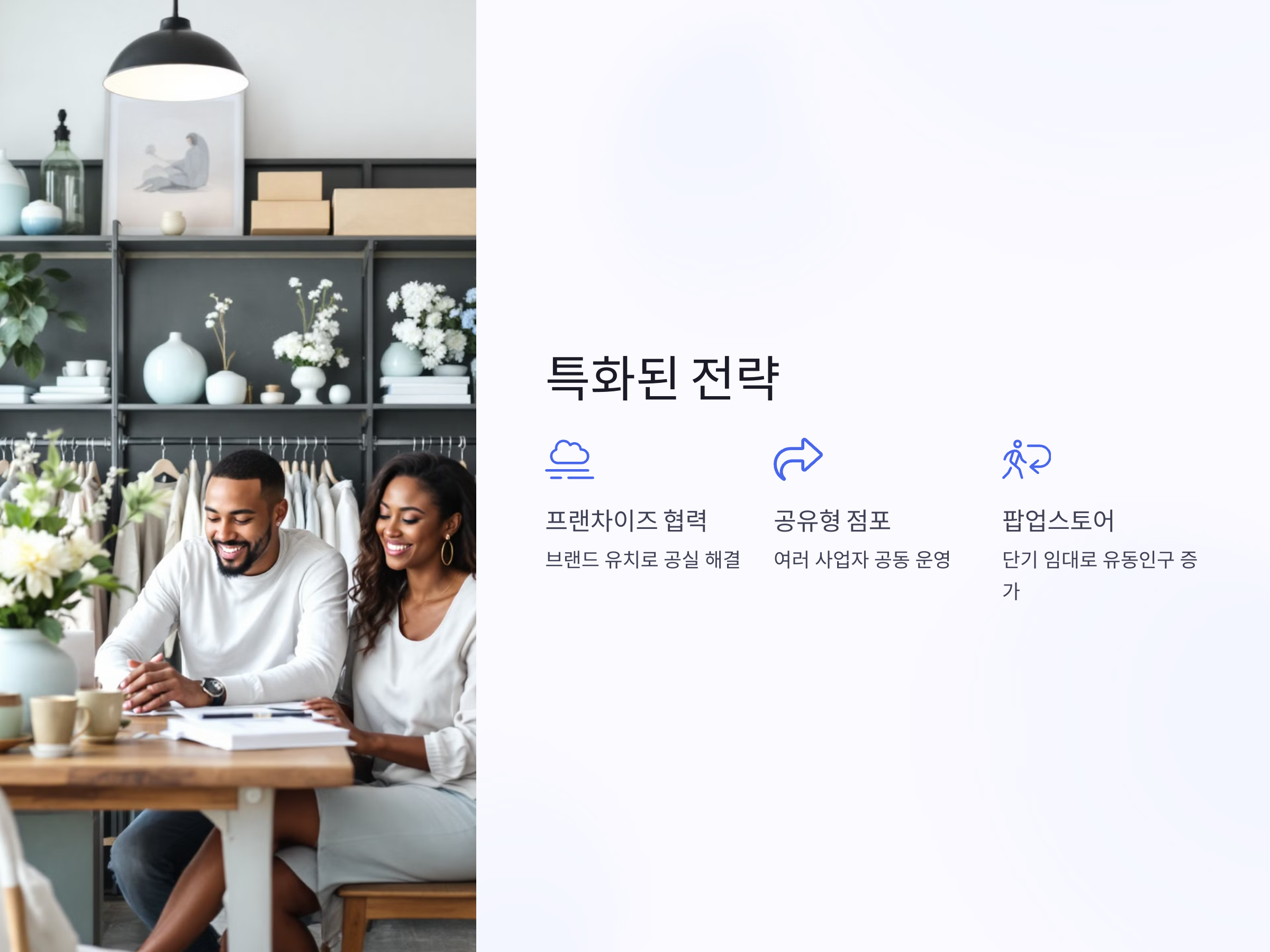 최근에는 하나의 매장을 여러 사업자가 공동으로 운영하는 공유형 점포가 인기를 끌고 있습니다. 이를 활용하면 임차인의 부담을 줄이고, 공실 문제를 해결할 수 있습니다.