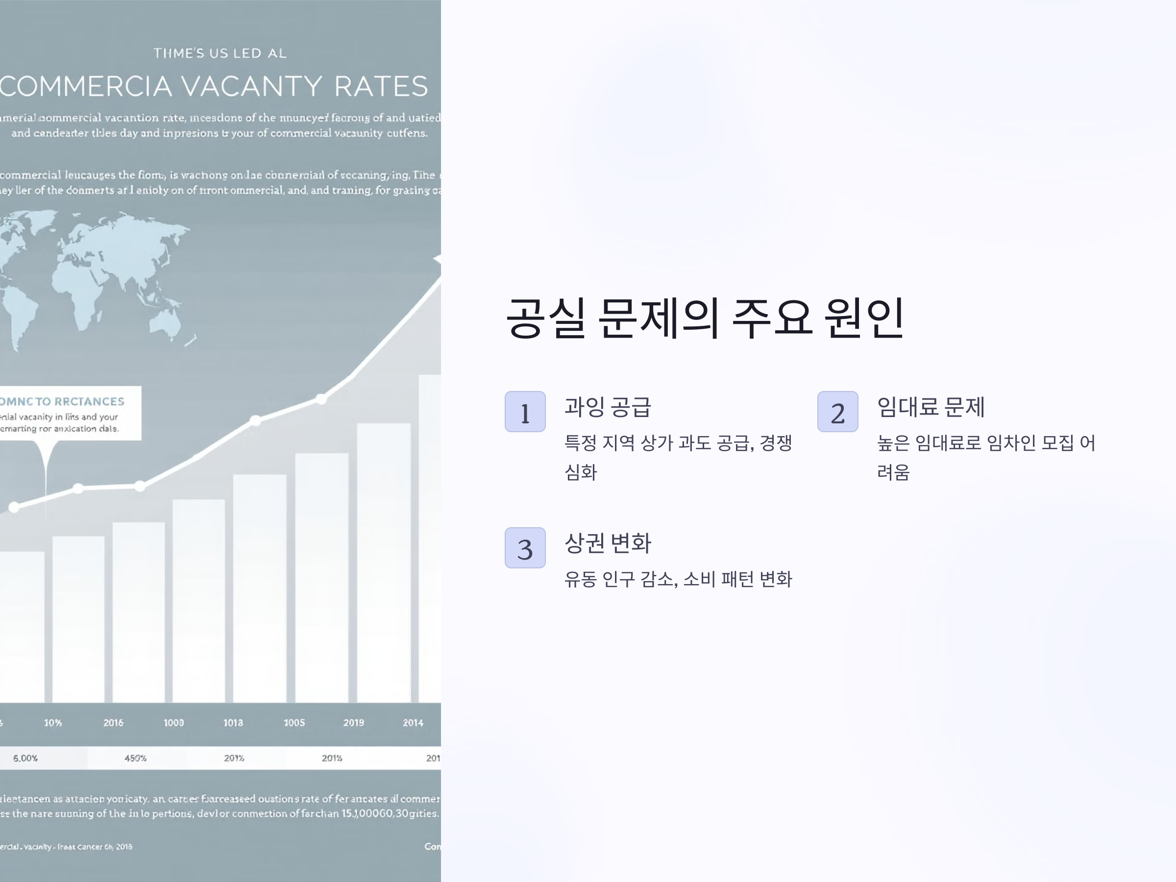 - 과잉 공급: 특정 지역에서 상가가 과도하게 공급되면 경쟁이 심화되고, 공실률이 높아질 수밖에 없습니다.