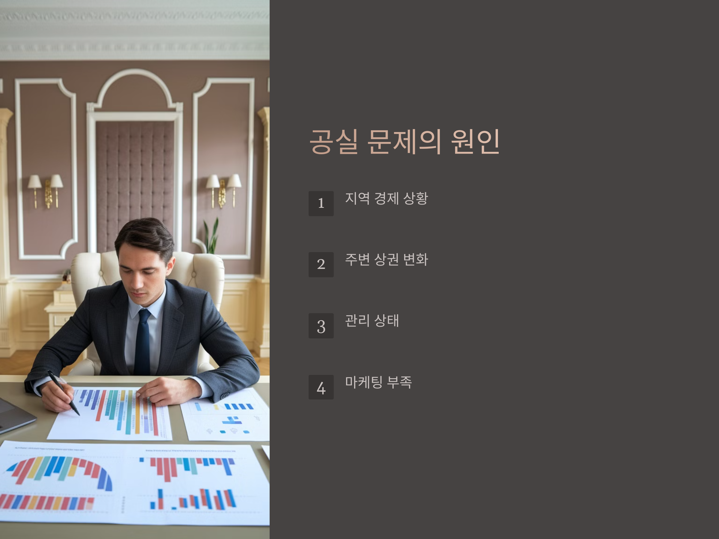 상가 공실을 줄이기 위해 가장 중요한 것은 정확한 원인 분석과 그에 맞는 맞춤형 전략을 세우는 것입니다. 리모델링, 마케팅 강화, 합리적인 임대료 책정 등 다양한 방법을 적용하여, 상가의 특성에 맞는 전략을 구사하는 것이 효과적입니다.