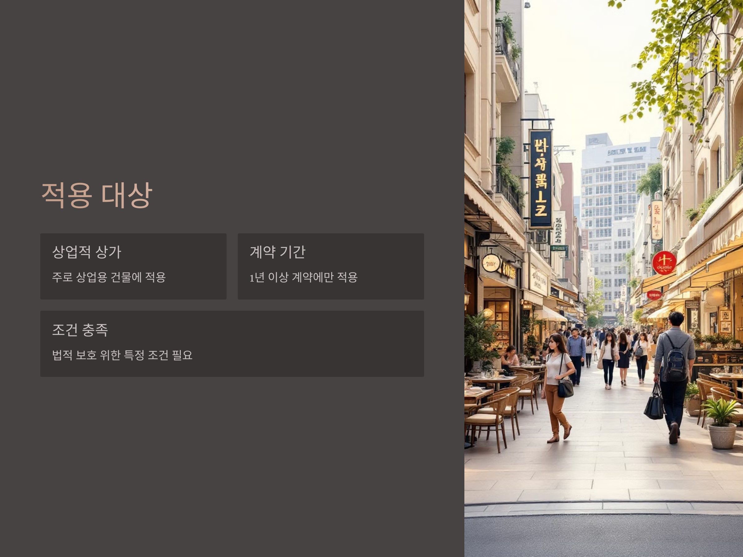 상가 권리금 보호법이 적용되는 대상은 주로 상업적 상가에 해당하며, 일정 조건을 충족해야 합니다. 이 법은 모든 상가 계약에 적용되는 것이 아니라, 일정 기간 이상 계약이 지속된 경우에만 해당됩니다. 예를 들어, 계약 기간이 1년 이상이어야 보호법의 적용을 받을 수 있습니다.