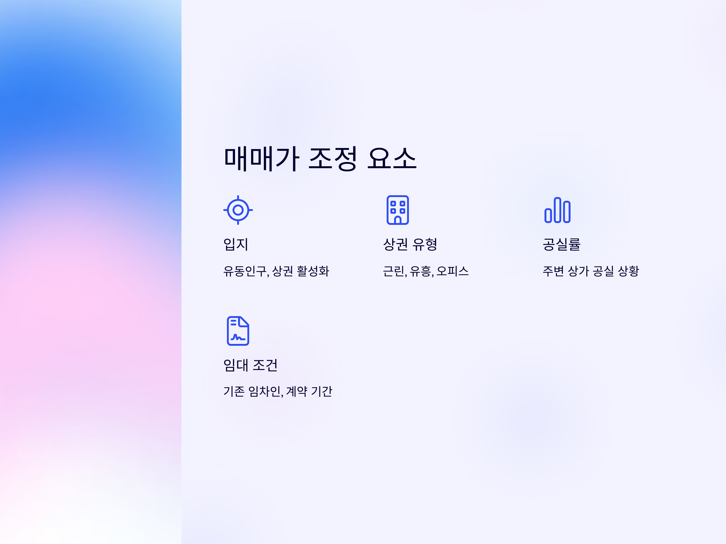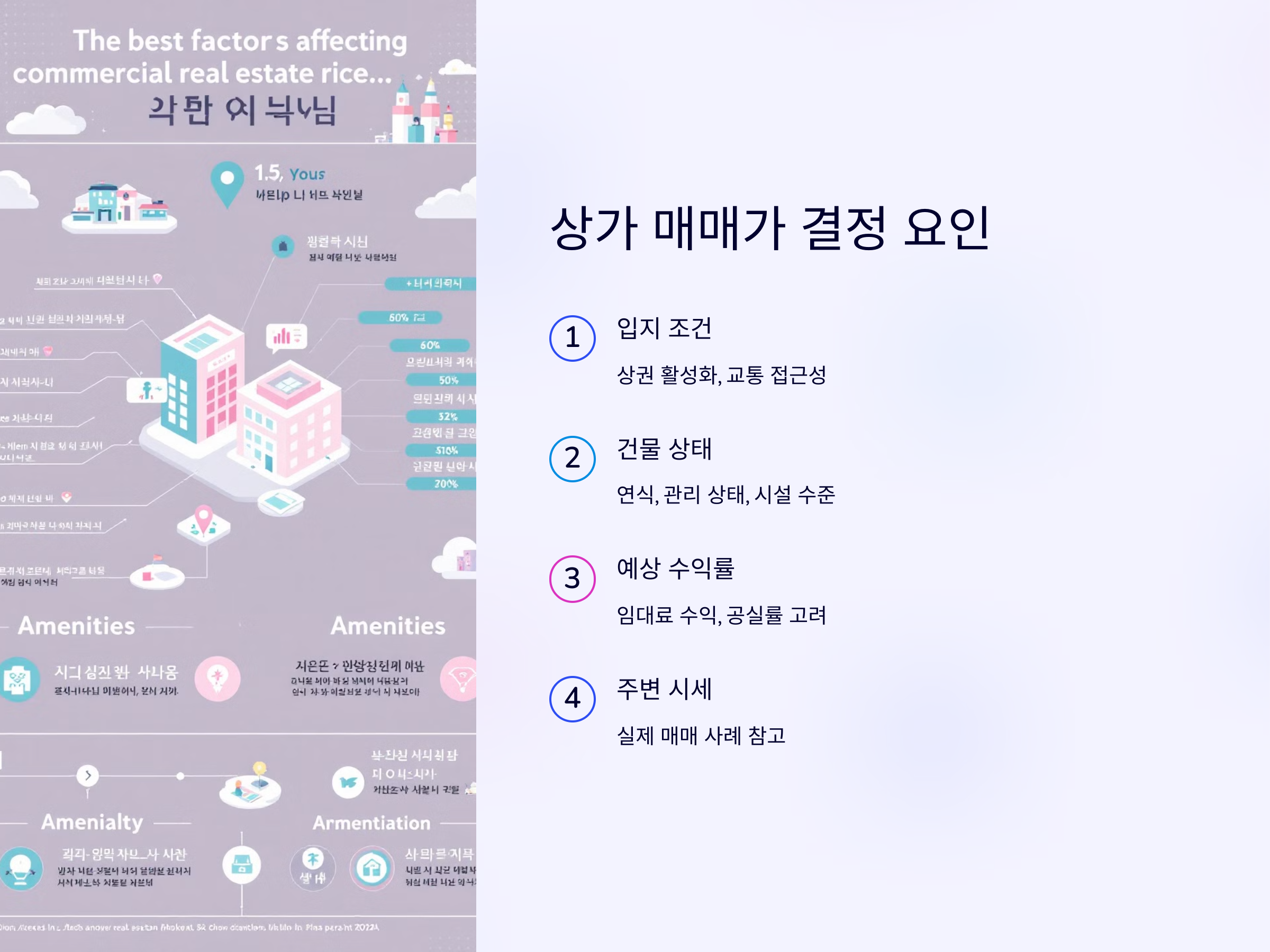 상가 매매가를 조정할 때는 다음과 같은 요소들을 종합적으로 고려해야 합니다: