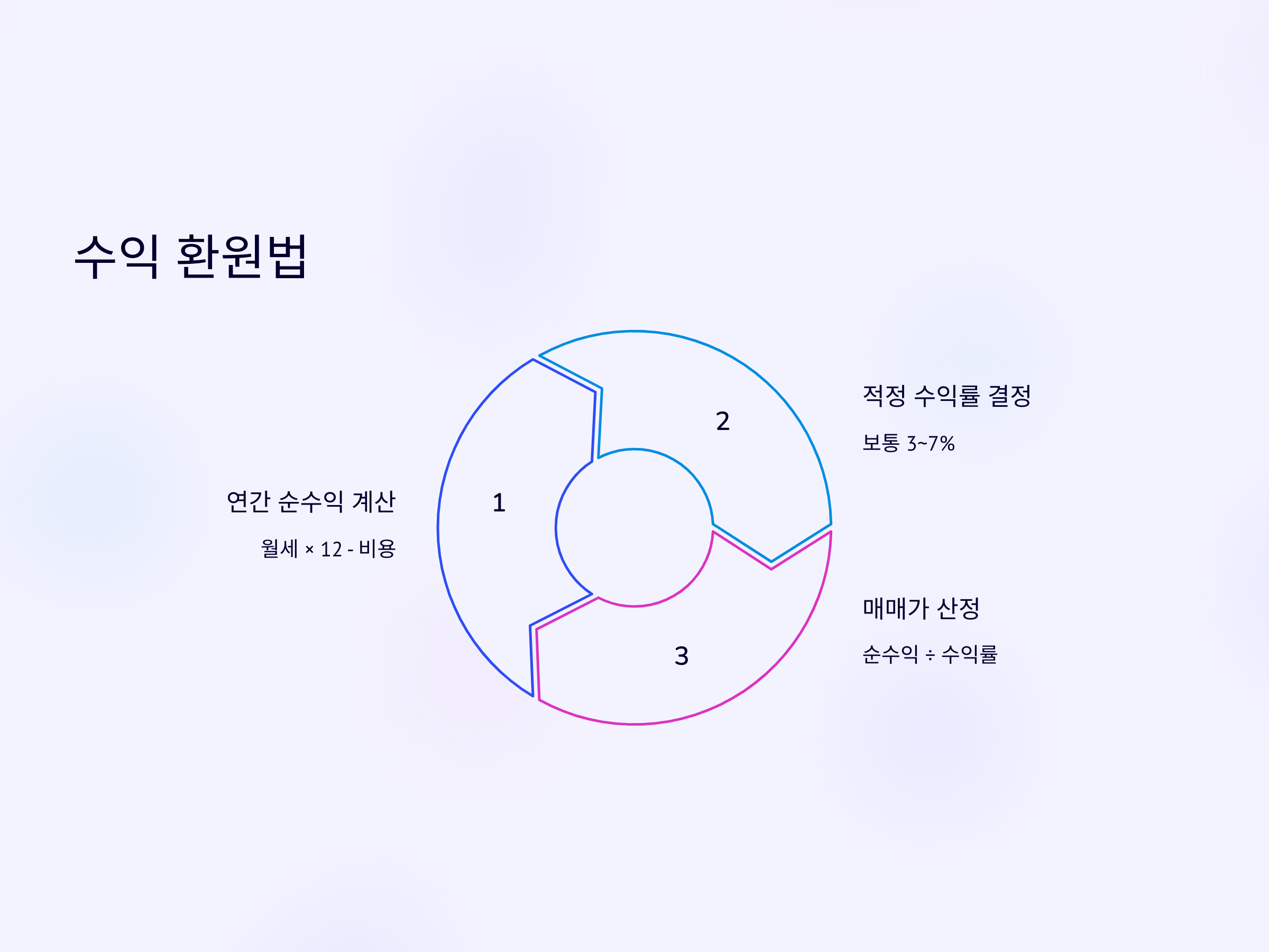 - 수익 환원법 (수익률 기반 평가): 상가의 매매가는 연간 기대 수익을 기준으로 한 적정 수익률을 반영하여 결정됩니다.