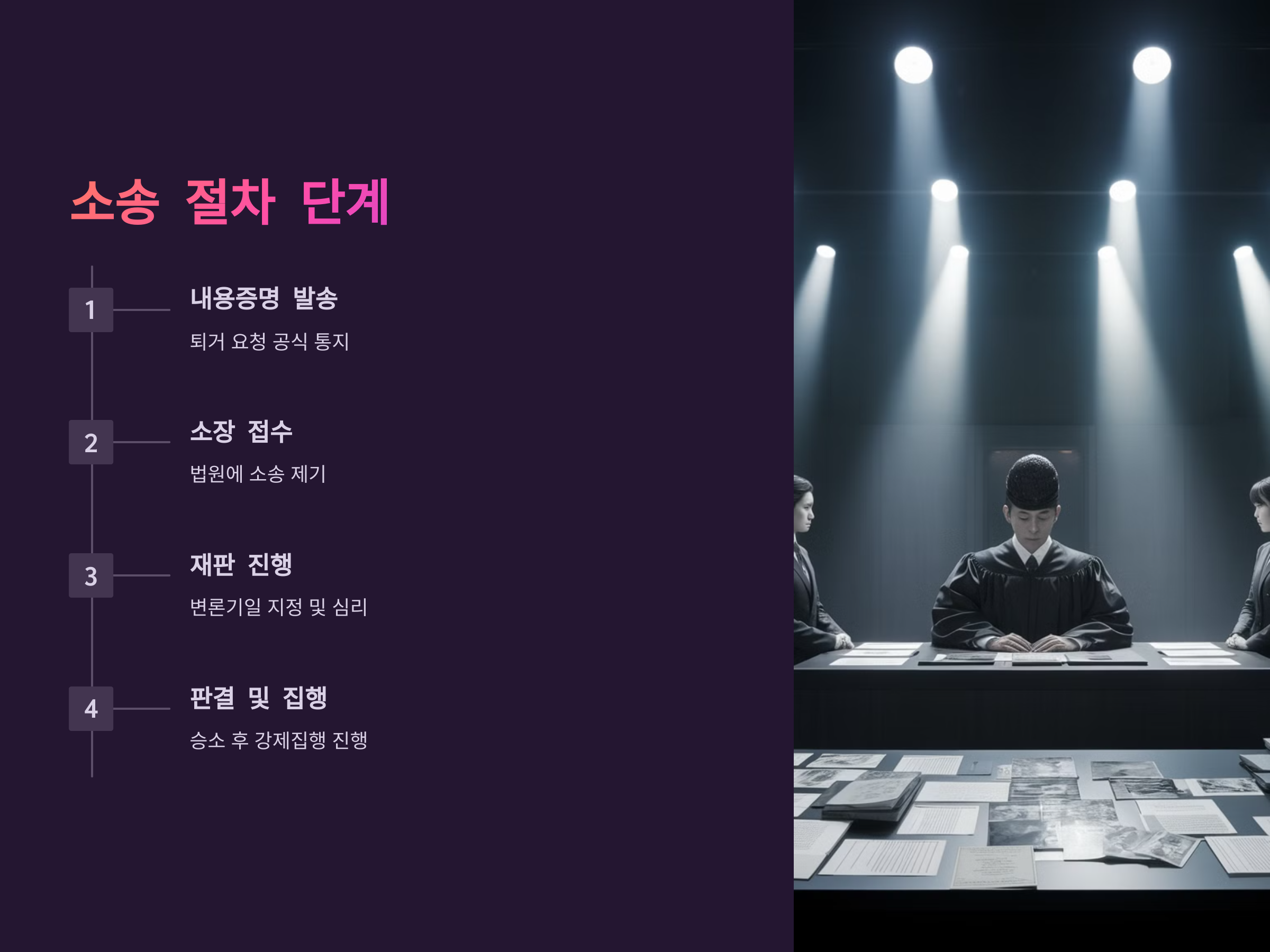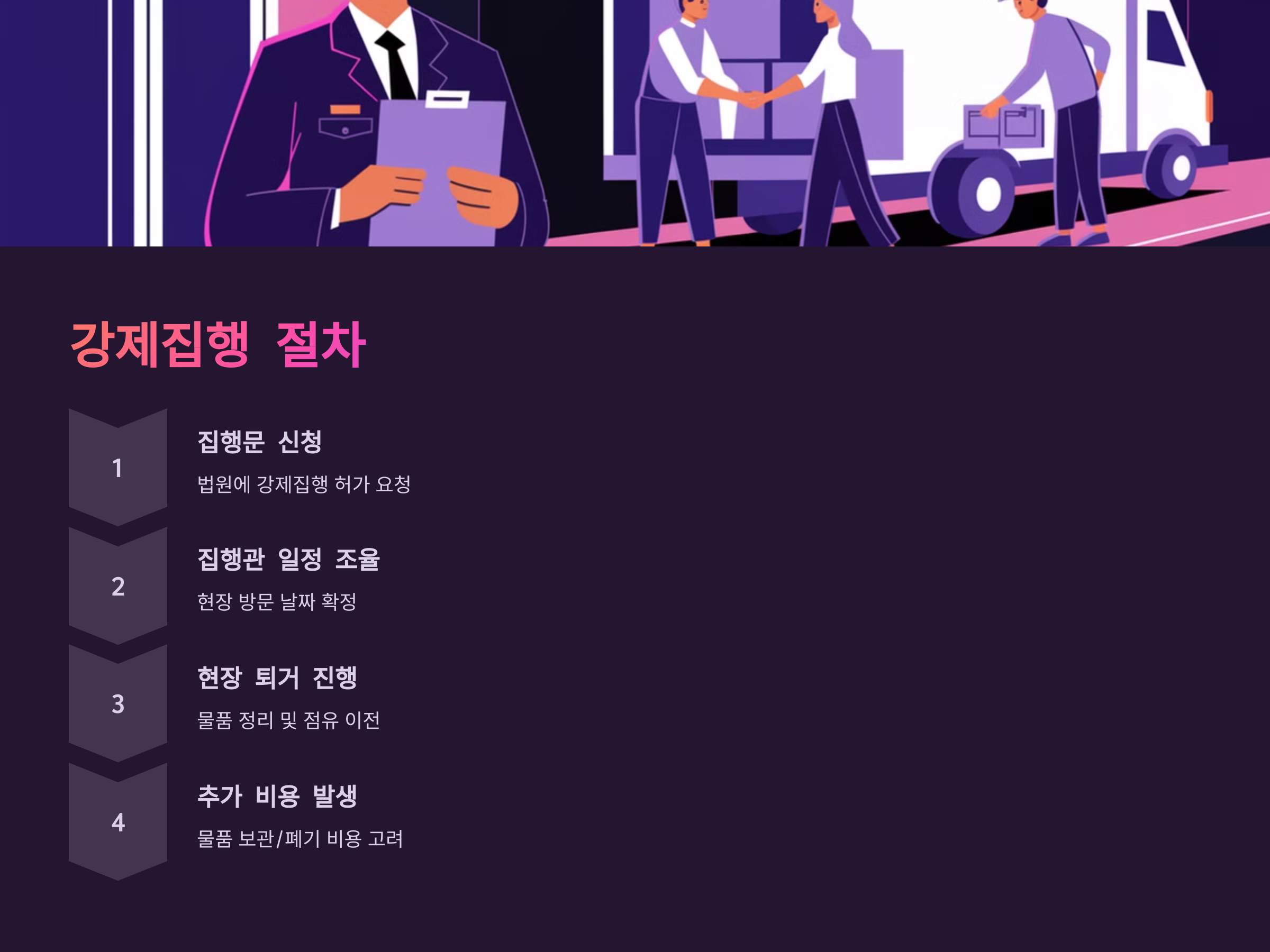 소송에서 승소 판결을 받은 후에도 임차인이 자진 퇴거하지 않으면 강제집행을 진행하게 됩니다. 강제집행을 위해서는 법원에 집행문 부여를 신청하고, 집행관과 일정 조율 후 현장에서 퇴거 절차가 이루어집니다. 이 과정에서 물품 보관, 폐기 비용까지 발생할 수 있으니 추가적인 예산도 고려해야 합니다. 또한, 강제집행이 확정되면 임차인의 신용에도 악영향을 미치게 되므로 협의를 통해 원만히 해결하는 것이 최선입니다.