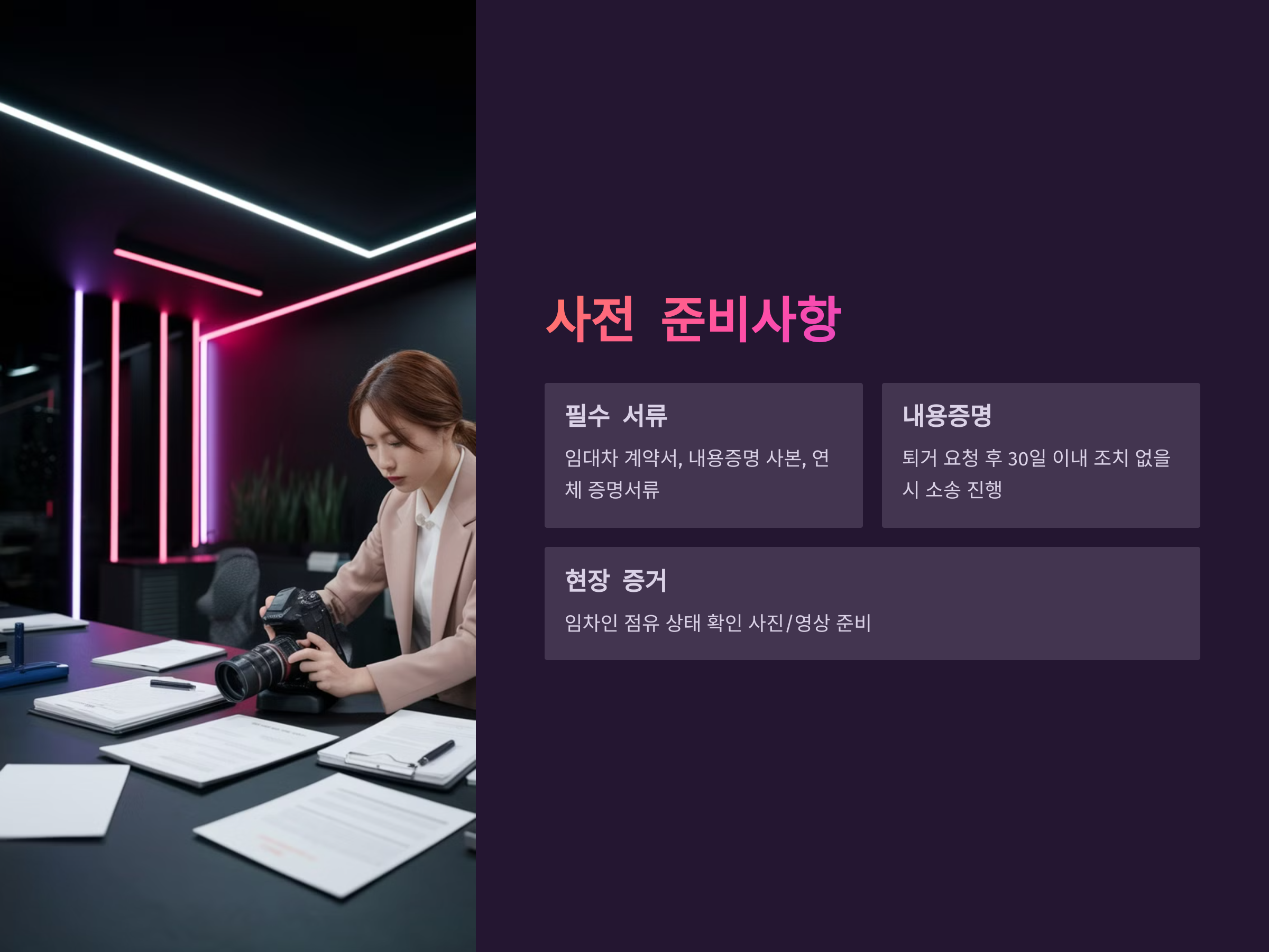 명도소송은 법적 절차이기 때문에 사전에 정확한 준비가 필요합니다. 첫째, 계약서에 명확한 종료 조건을 기재하고, 둘째, 연체가 발생하면 즉시 내용증명을 보내는 것이 중요합니다. 또한, 법률 전문가의 상담을 통해 절차를 빠르게 진행하는 것도 비용과 시간을 줄이는 방법입니다. 무엇보다 소송 과정에서 감정적으로 대응하지 않고, 증거 중심으로 체계적으로 준비하는 것이 승소의 핵심입니다.