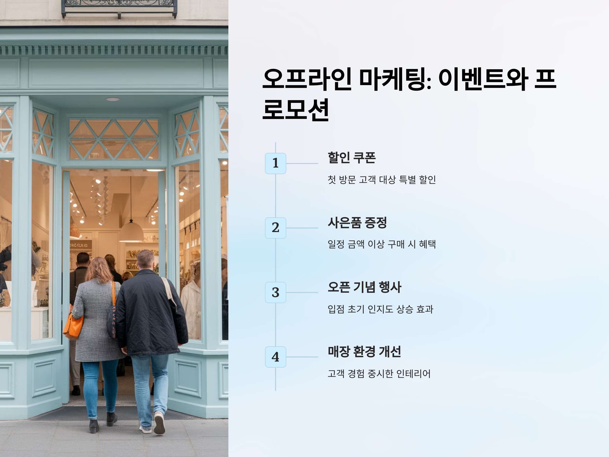 단, 오프라인 마케팅은 이벤트 외에도 매장 내 환경을 꾸미고 고객의 경험을 중요시하는 것이 필수적입니다. 매장 내 디스플레이, 직원의 친절도, 청결 상태 등은 고객들에게 상가에 대한 첫 인상을 강하게 남깁니다.