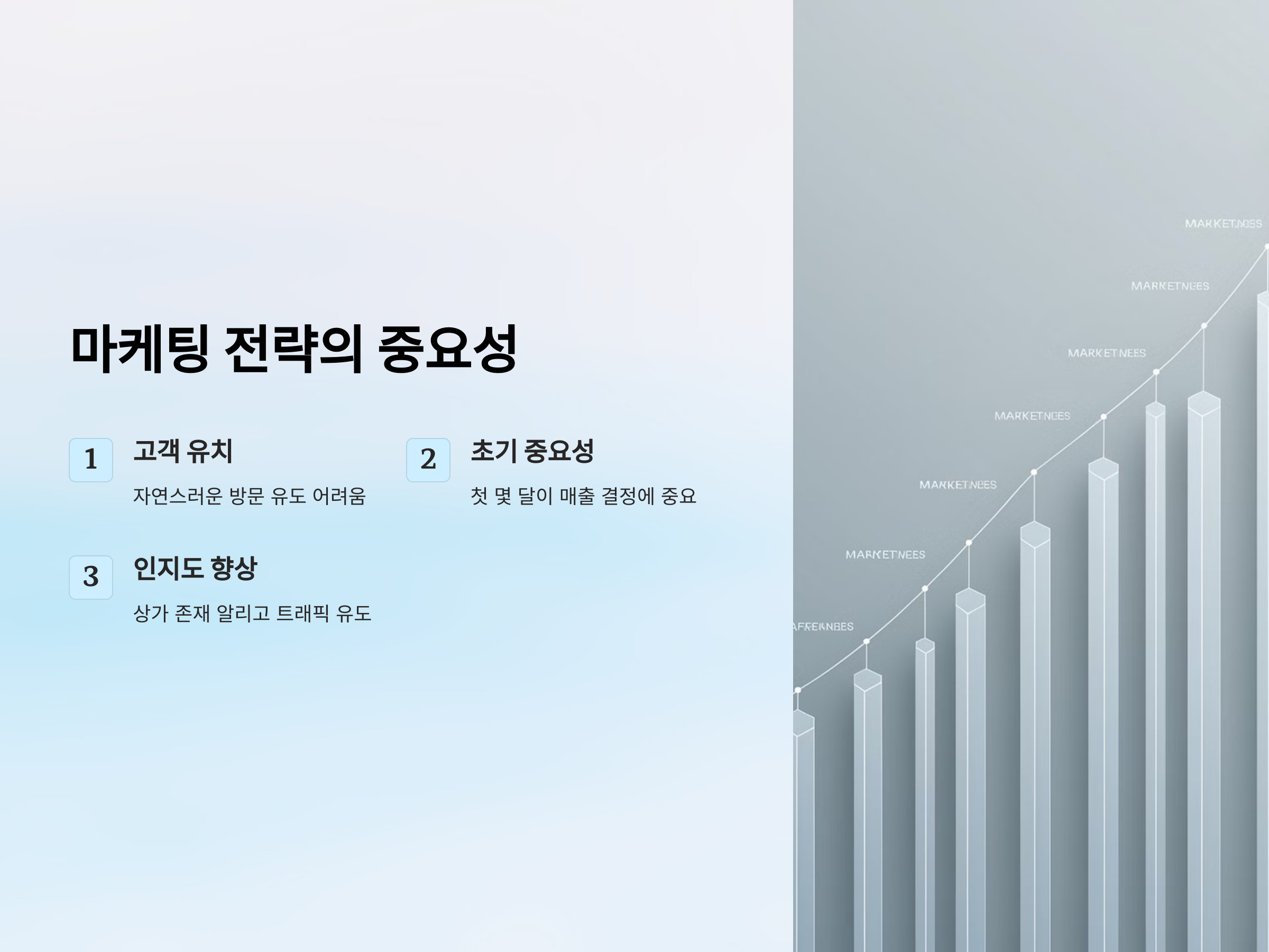 마케팅 전략의 핵심은 고객의 관심을 끄는 것과 동시에 지속적인 방문을 유도하는 것입니다. 적절한 마케팅을 통해 고객이 반복적으로 방문하게 만들면, 상가는 안정적인 수익을 창출할 수 있습니다.