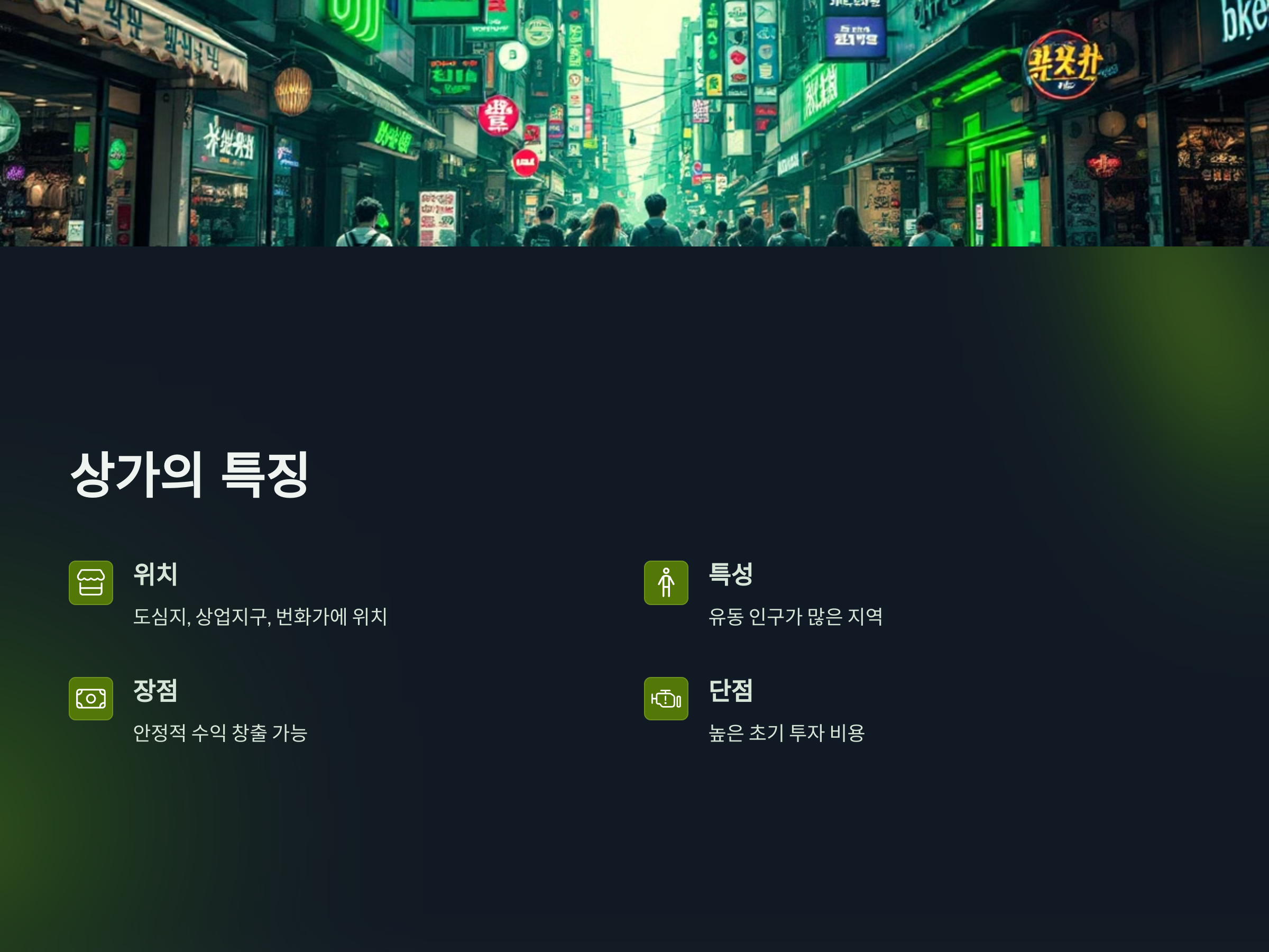 상가의 장점은 안정적인 수익 창출이 가능하다는 점입니다. 번화가나 상업지구에 위치한 상가는 높은 유동 인구를 자랑하며, 자주 방문하는 고객들이 많습니다. 이를 통해 임대 수익을 얻을 수 있는 기회가 많고, 또한 상가의 시세 차익도 기대할 수 있습니다. 하지만 상가의 단점은, 높은 초기 투자 비용과 함께 상업적 성공이 보장되지 않는 점이 있을 수 있다는 것입니다. 특히 경쟁이 치열한 상업지구에서는 사업이 실패할 확률도 존재합니다.