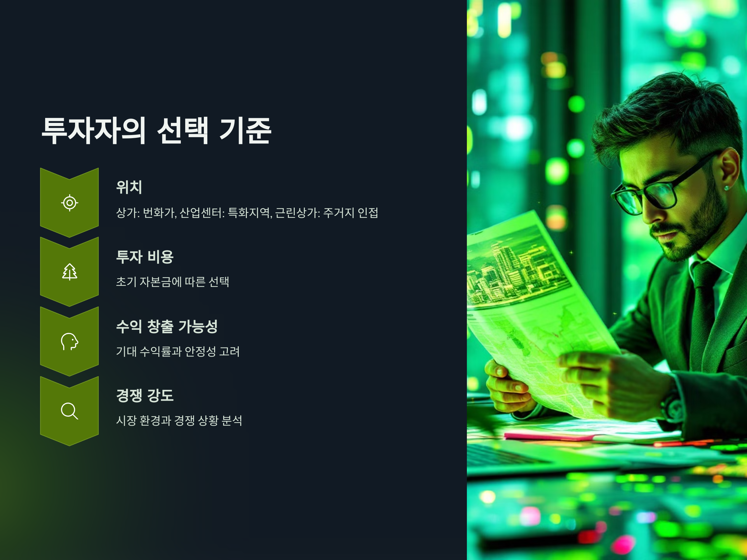 각각의 상가 유형을 비교한 후, 어떤 유형이 투자자에게 더 유리한지 판단하려면 몇 가지 기준을 고려해야 합니다. 먼저, 위치가 가장 중요합니다. 상가는 대개 유동 인구가 많은 지역에 위치해야 하므로, 도심지나 번화가에 투자하는 것이 좋습니다. 상가지식산업센터는 특정 산업에 특화된 공간으로, 산업군에 대한 이해와 그 성장 가능성을 고려해야 합니다. 근린상가는 주거지 근처에서 생활 편의성을 제공하는 상업 공간이므로, 주거지의 특성과 주변 환경을 고려하여 선택해야 합니다.