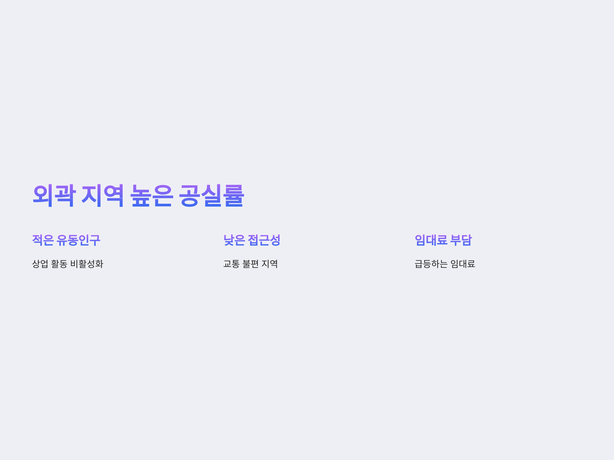 반면, 외곽 지역의 상가는 공실률이 높은 경우가 많습니다. 외곽 지역은 도심에 비해 유동인구가 적고, 상업 활동이 활발하지 않기 때문에 임대 수요가 적어 공실률이 높게 나타납니다. 특히, 교통이 불편한 지역이나 상업시설과의 접근성이 떨어지는 곳은 상가가 공실 상태로 남을 확률이 큽니다.