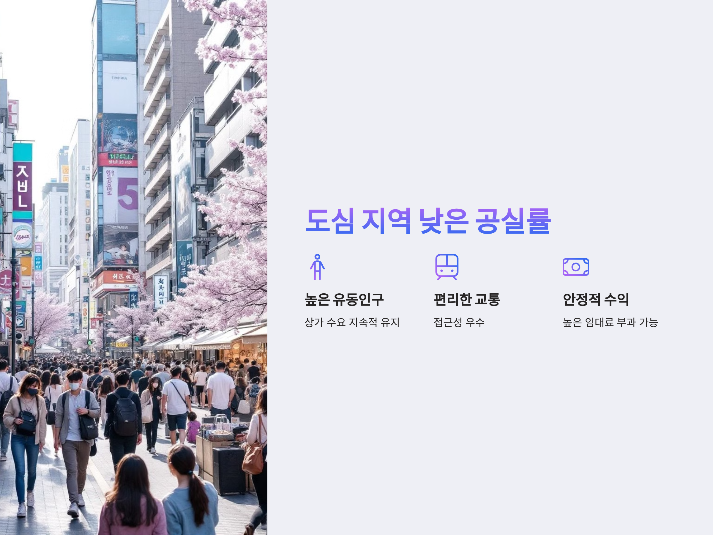 도심 지역, 특히 서울 강남, 종로, 명동과 같은 핵심 상업지구는 높은 공실률을 기록하지 않는 경우가 많습니다. 이 지역들은 상업 활동이 활발하고 유동인구가 많아 상가 수요가 지속적으로 유지됩니다. 교통이 편리하고, 다양한 상업 시설과의 연계성도 중요한 요소로 작용합니다.