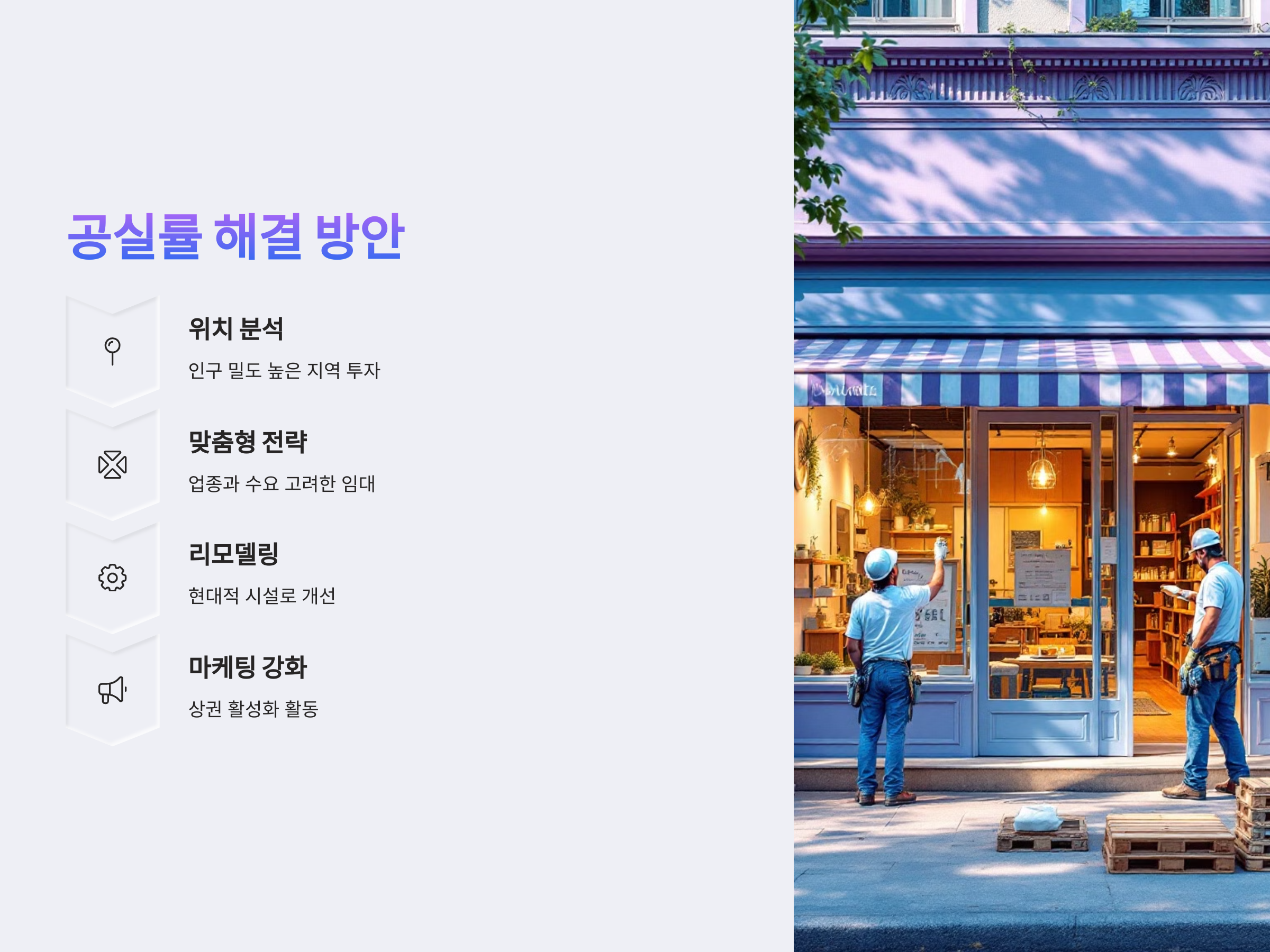상가지역별 공실률을 해결하기 위해서는 몇 가지 전략을 고려해야 합니다. 첫째, 상가의 위치를 꼼꼼히 분석하여 인구 밀도가 높은 지역에 투자하는 것이 중요합니다. 둘째, 상가의 업종과 수요를 고려하여 맞춤형 임대 전략을 세워야 합니다. 예를 들어, 주거지 근처의 상가는 생활 필수품을 판매하는 업종에 유리할 수 있습니다.