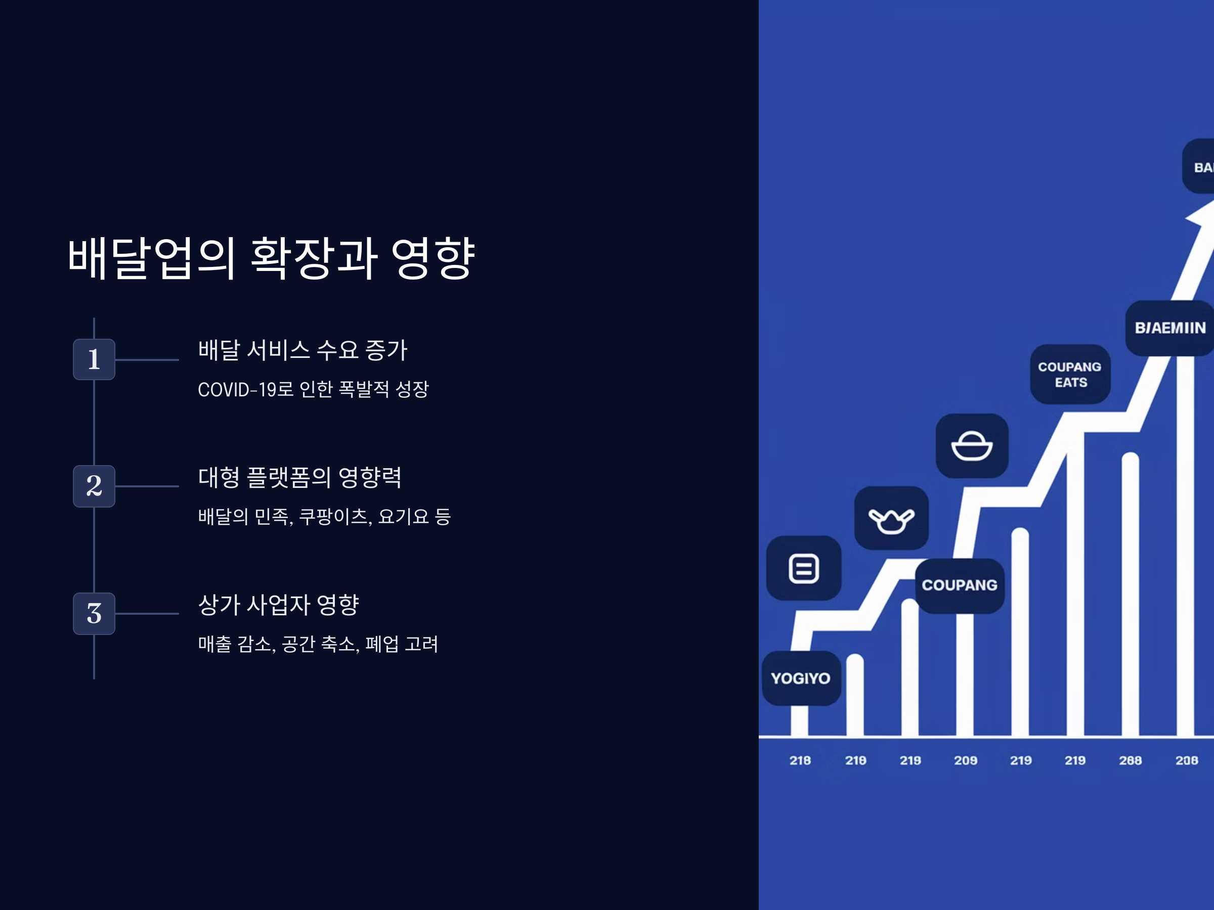 배달업체와의 경쟁에서 살아남기 위해서는 배달 서비스를 자체적으로 제공하거나, 배달 플랫폼과의 협력을 통해 매출을 확대하는 전략이 필요합니다. 또한, 상가 사업자는 독특한 오프라인 경험을 강화하고, 로컬화 전략을 통해 지역 소비자들의 충성도를 얻는 것이 중요합니다.