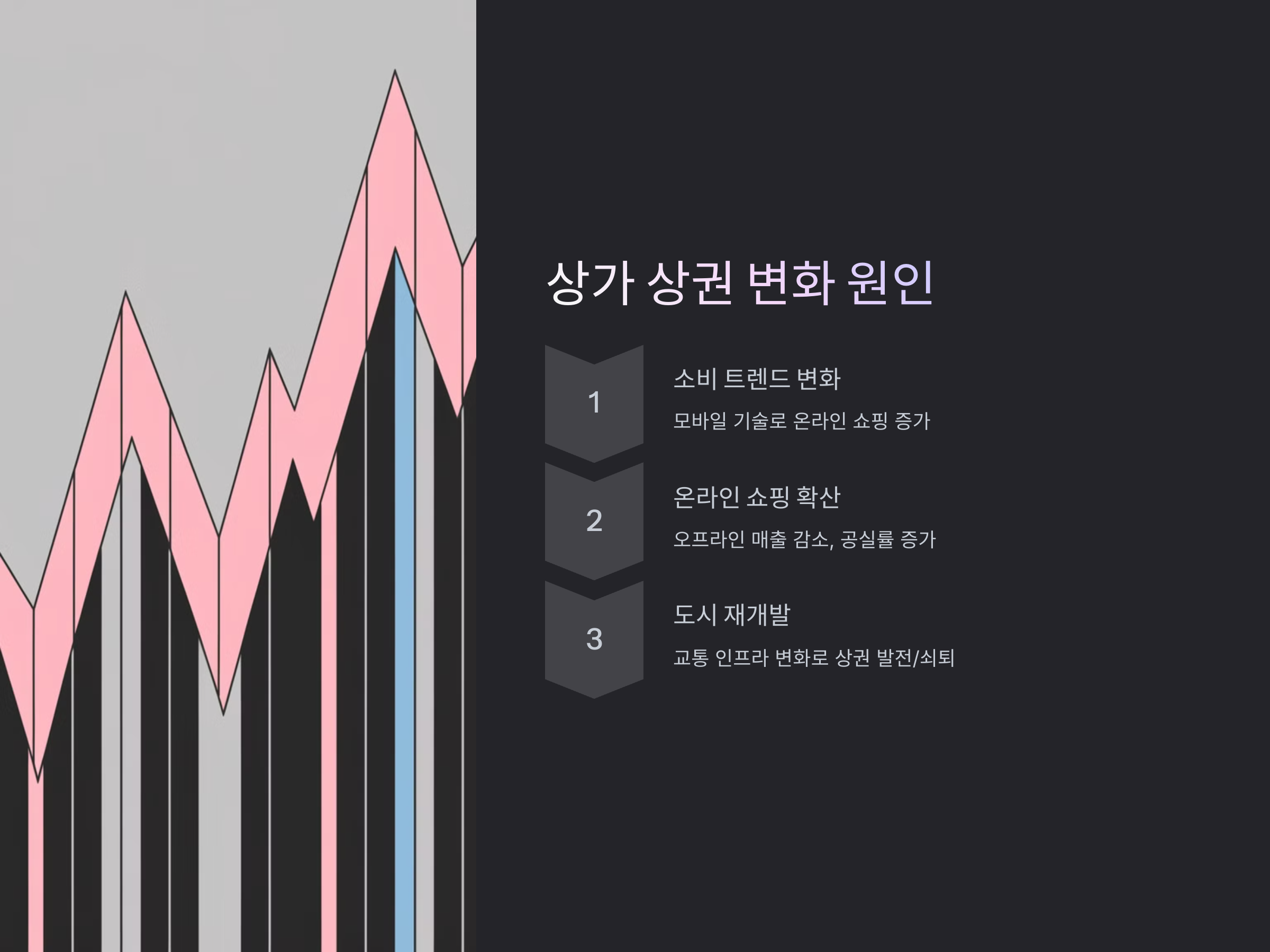 상가 상권의 변화는 다양한 원인에 의해 발생합니다. 최근 몇 년 간의 상권 변화에서 주요한 원인으로는 소비 트렌드의 변화, 온라인 쇼핑의 확산, 그리고 도시 재개발과 같은 외부적 요인들이 있습니다.