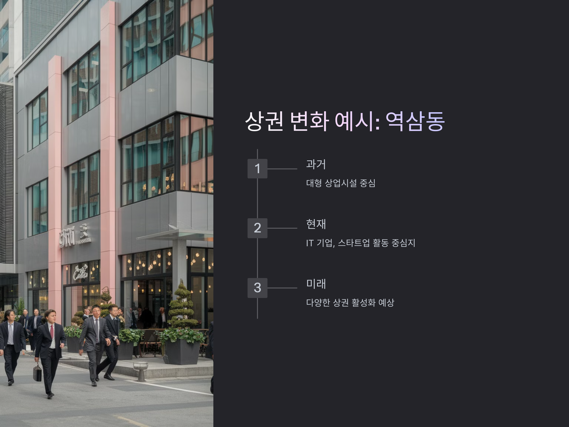 상권 변화를 예측하기 위한 구체적인 예시를 들어보겠습니다. 예를 들어, 서울 강남구의 역삼동은 최근 몇 년간 상권이 활발히 변화하고 있는 지역입니다. 강남구는 교통망이 잘 발달되어 있고, 인프라가 지속적으로 확장되고 있기 때문에, 상권의 변화 추이가 매우 중요합니다.