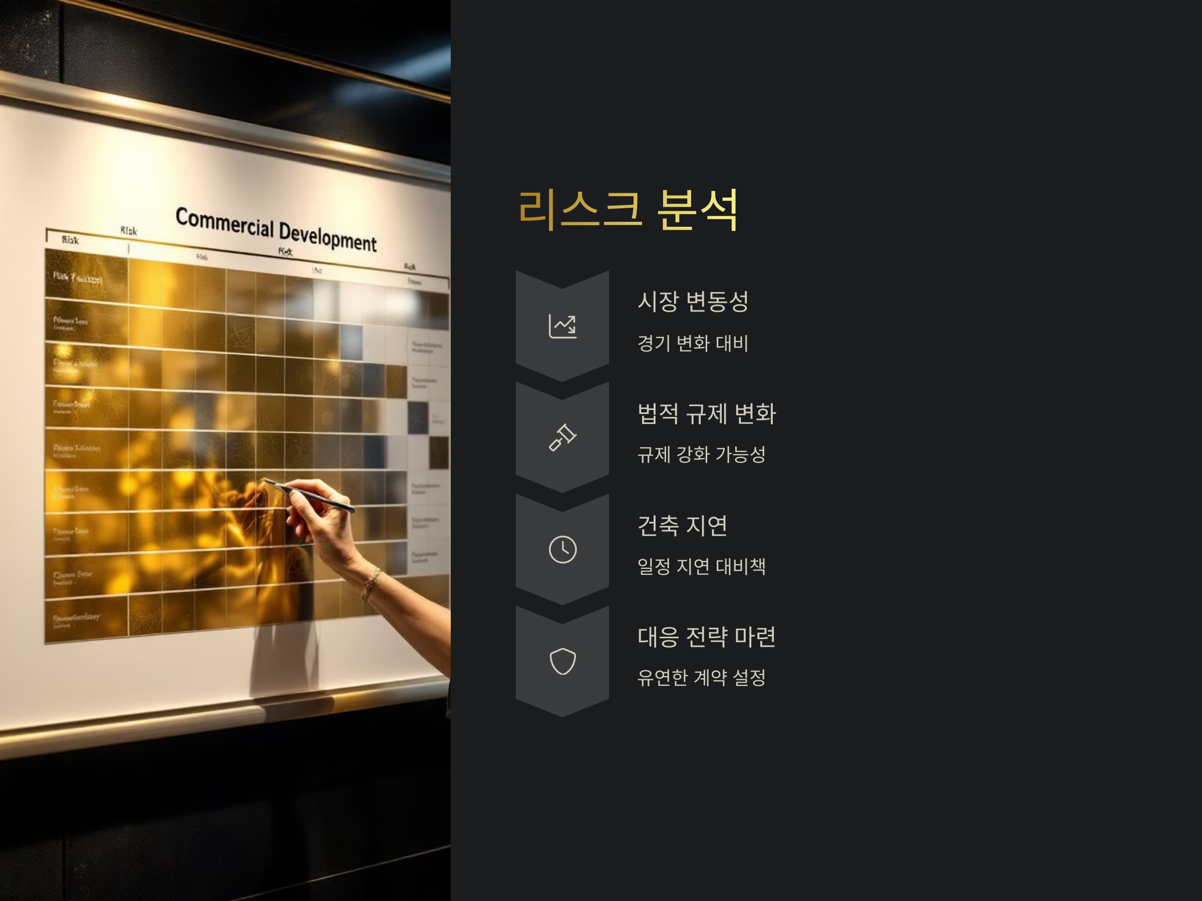 리스크 분석은 단순히 리스크를 파악하는 데 그치지 않고, 각 리스크에 대한 대응 전략을 마련하는 것이 핵심입니다. 예를 들어, 시장의 불확실성에 대비하기 위해 임대 계약을 유연하게 설정하거나, 건축 지연에 대비한 보험 가입 등을 고려할 수 있습니다.