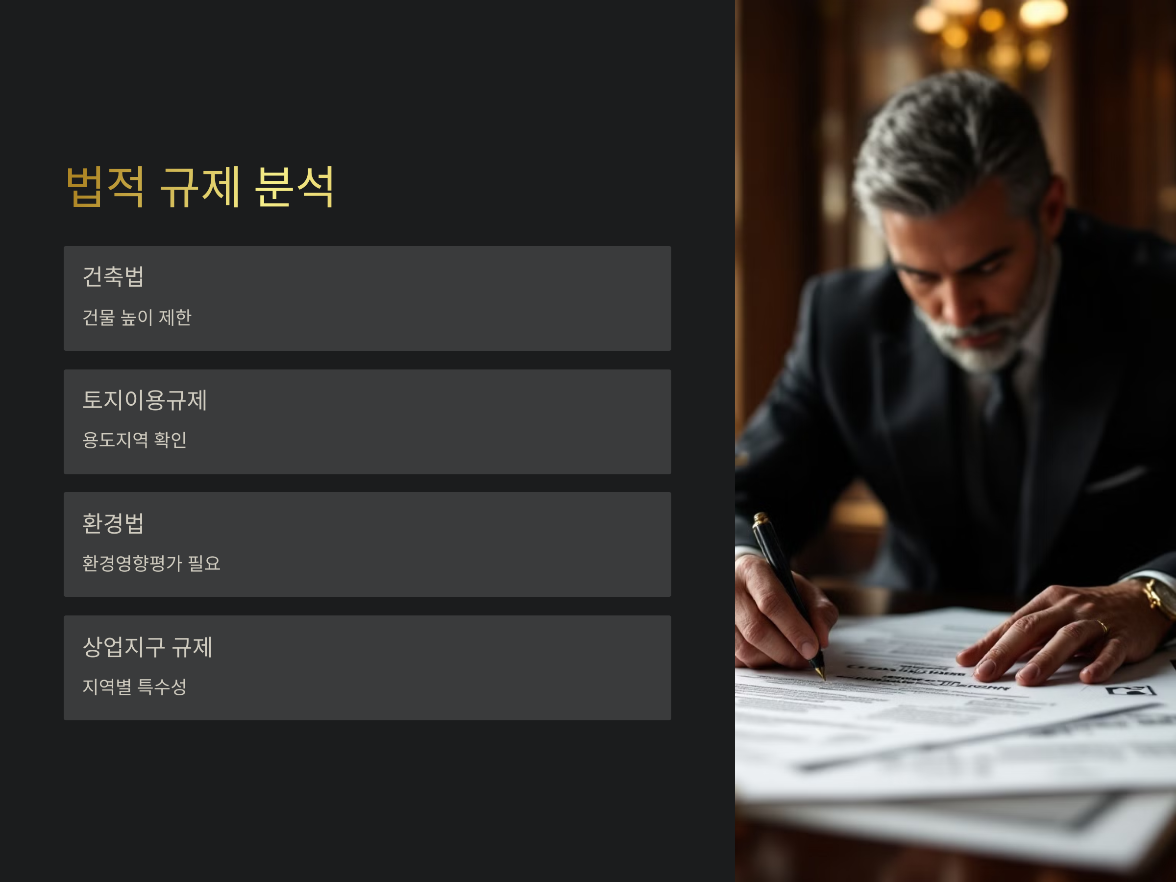상가 개발 시 고려해야 할 주요 법적 규제는 건축법, 토지이용규제, 환경법, 상업지구 규제 등이 있습니다. 이러한 규제를 잘못 이해하거나 무시하면, 개발 계획이 취소되거나 추가 비용이 발생할 수 있습니다. 특히, 건축 허가를 받기 위한 절차와 시간도 중요한 요소로 작용하므로, 이 부분을 신속하게 처리해야 합니다.