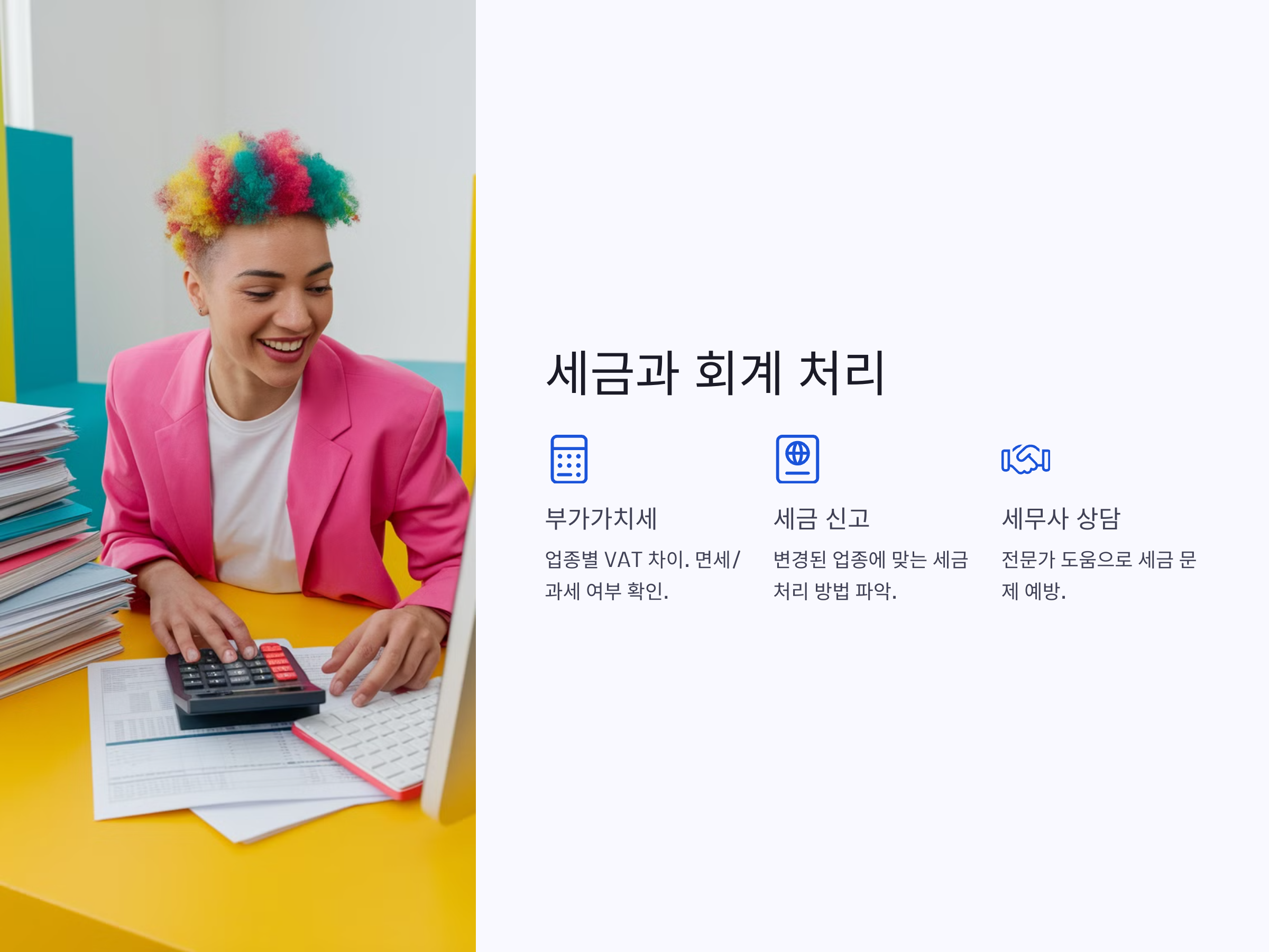 업종 변경 후 부가가치세(VAT)가 달라질 수 있습니다. 특히 업종에 따라 면세와 과세 여부가 달라지므로, 세금 신고 시 업종 변경에 따른 부가가치세 처리 방법을 정확히 확인해야 합니다.