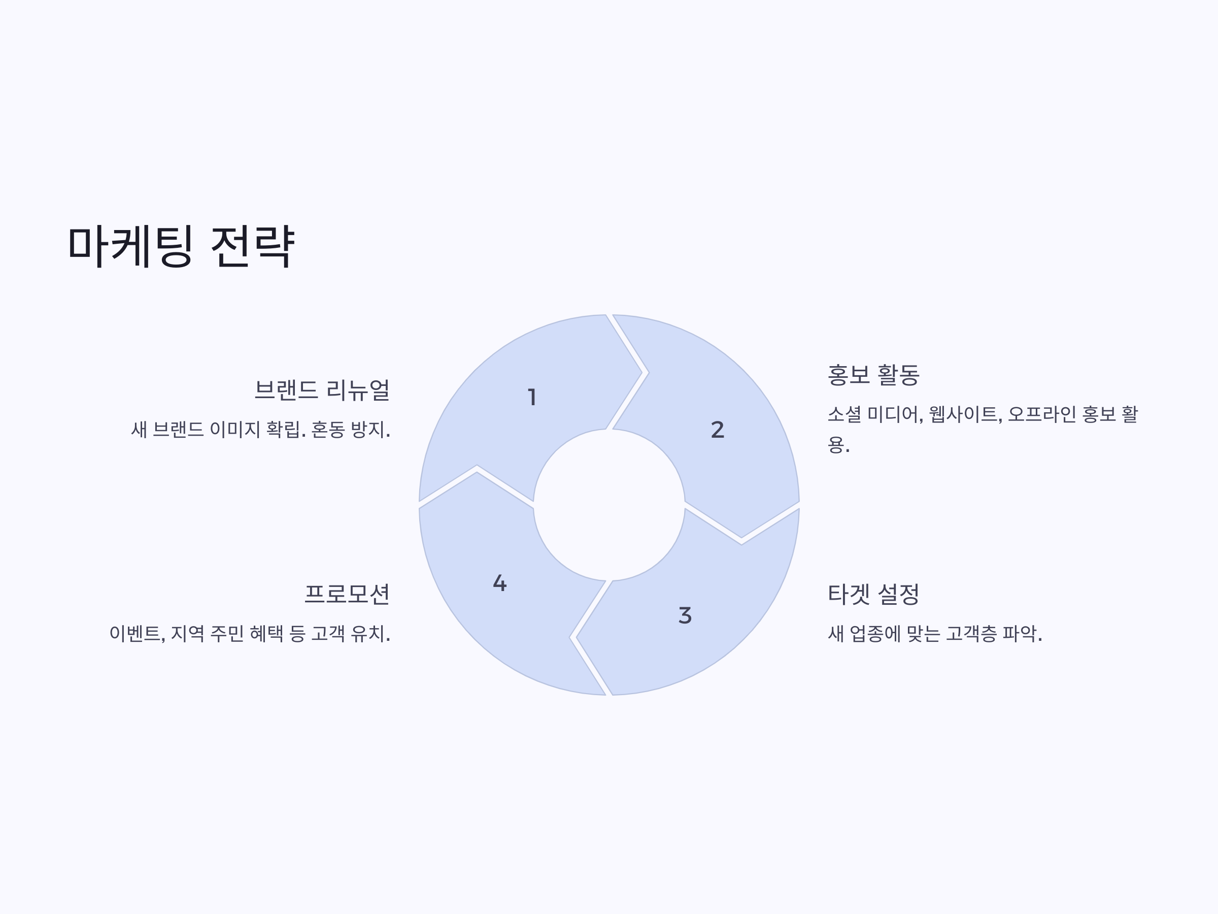업종 변경 후에는 새로운 브랜드 이미지로 리뉴얼하는 것이 중요합니다. 기존의 고객들이 혼동하지 않도록 새로운 브랜드 아이덴티티를 확립하고, 이를 홍보하는 데 주력해야 합니다. 소셜 미디어, 웹사이트, 오프라인 홍보 등을 통해 변경된 업종을 적극적으로 알리는 것이 필요합니다.