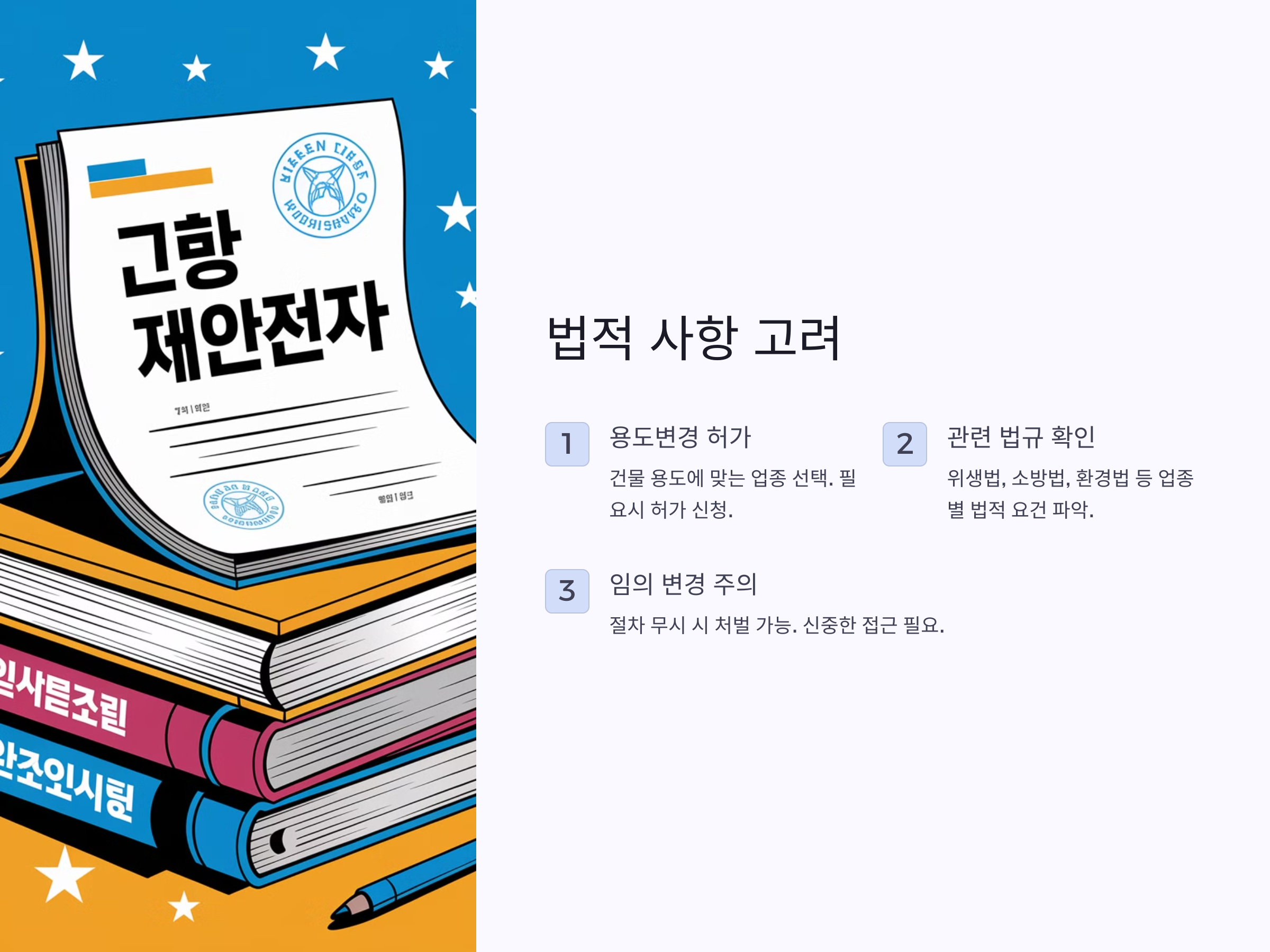 상가 업종을 변경하려면 가장 먼저 고려해야 할 점은 법적 요건입니다. 업종 변경은 단순한 상호명 변경과는 다르게, 관련 법률과 규제에 따라 일정한 절차를 밟아야 합니다. 이를 무시하고 임의로 업종을 변경할 경우, 처벌을 받을 수 있기 때문에 각별히 주의해야 합니다.