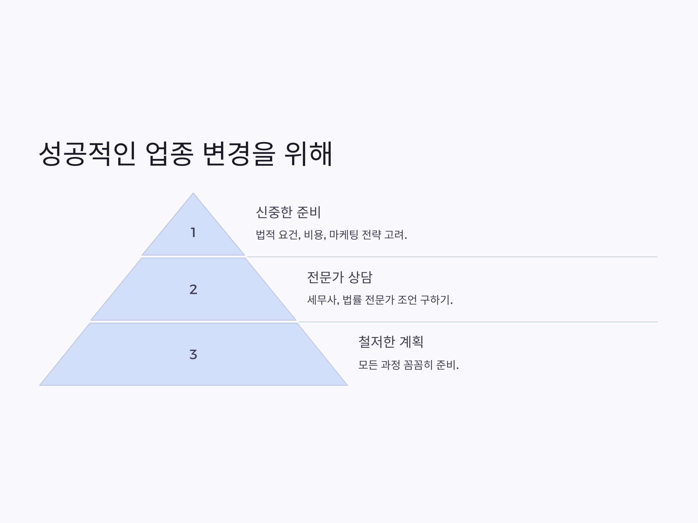 업종 변경 시, 해당 업종에 적용되는 법규를 꼼꼼히 살펴봐야 합니다. 예를 들어, 음식점으로 변경할 경우 위생법, 소방법, 환경법 등 다양한 법적 요건이 따라옵니다. 이러한 법률을 제대로 이해하지 못한 채 업종을 변경하면, 후속적인 문제가 발생할 수 있습니다.