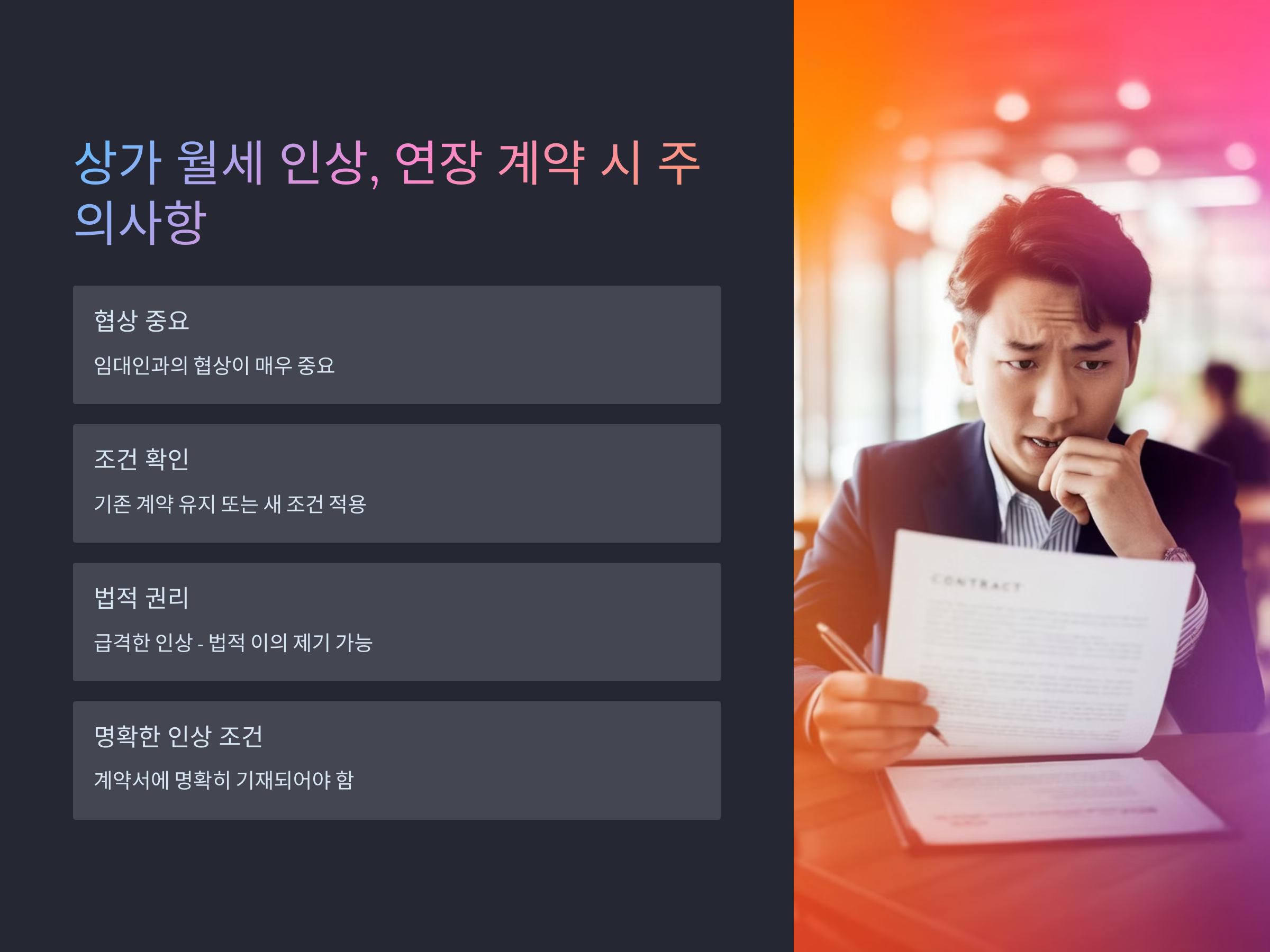 상가 임대차 계약에서 월세 인상뿐만 아니라 계약 연장 시에도 주의할 점이 있습니다. 만약 계약 연장을 고려하고 있다면, 임대인과의 협상이 매우 중요합니다. 연장 계약 시에는 기존 계약의 조건을 그대로 유지하는지, 아니면 새로운 조건을 적용할지에 대한 협의가 필수적입니다.