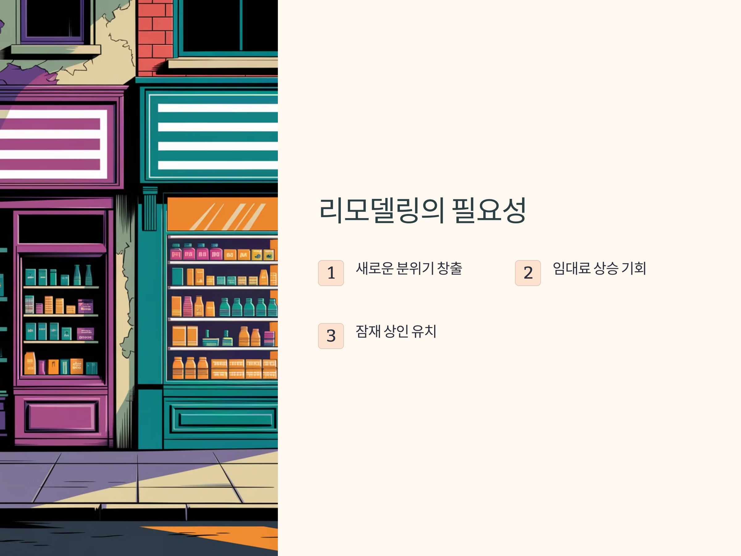 리모델링을 통해 상가는 단순히 새로운 인테리어를 추가하는 것 이상의 효과를 얻을 수 있습니다. 점포가 철수되고 비어있는 공간을 그대로 두는 것은 상가에 대한 인식에 큰 영향을 미칠 수 있습니다. 오래된 점포는 고객들에게 낡고 불편한 이미지로 비춰질 수 있으므로, 리모델링을 통해 새로운 분위기와 기능을 추가하는 것이 중요합니다. 리모델링은 또한 임대료를 올리고, 새로 유입될 수 있는 잠재적 상인들을 대상으로 매력적인 공간을 제공할 수 있는 기회를 제공합니다.