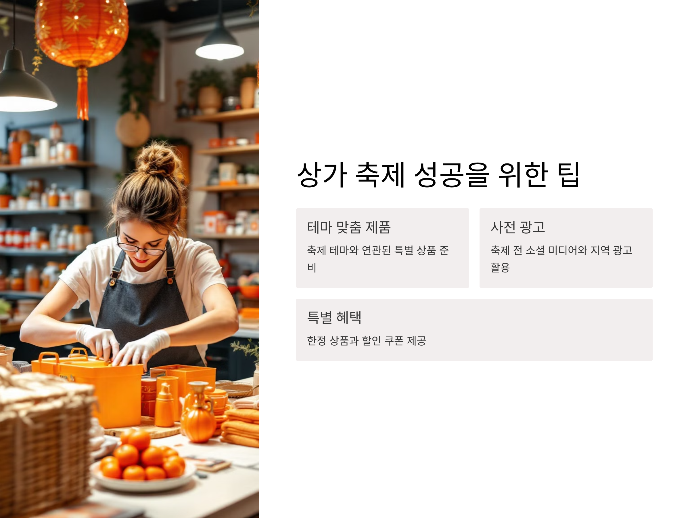 상가들이 지역 축제에서 성공적인 매출 증대를 이루기 위해서는 몇 가지 팁을 고려해야 합니다. 첫째, 축제의 테마에 맞는 제품을 준비해야 합니다. 고객들은 축제와 관련된 특별한 제품에 관심을 가질 가능성이 높습니다. 예를 들어, 겨울 축제라면 따뜻한 의류나 패션 아이템을 집중적으로 준비하는 것이 좋습니다.