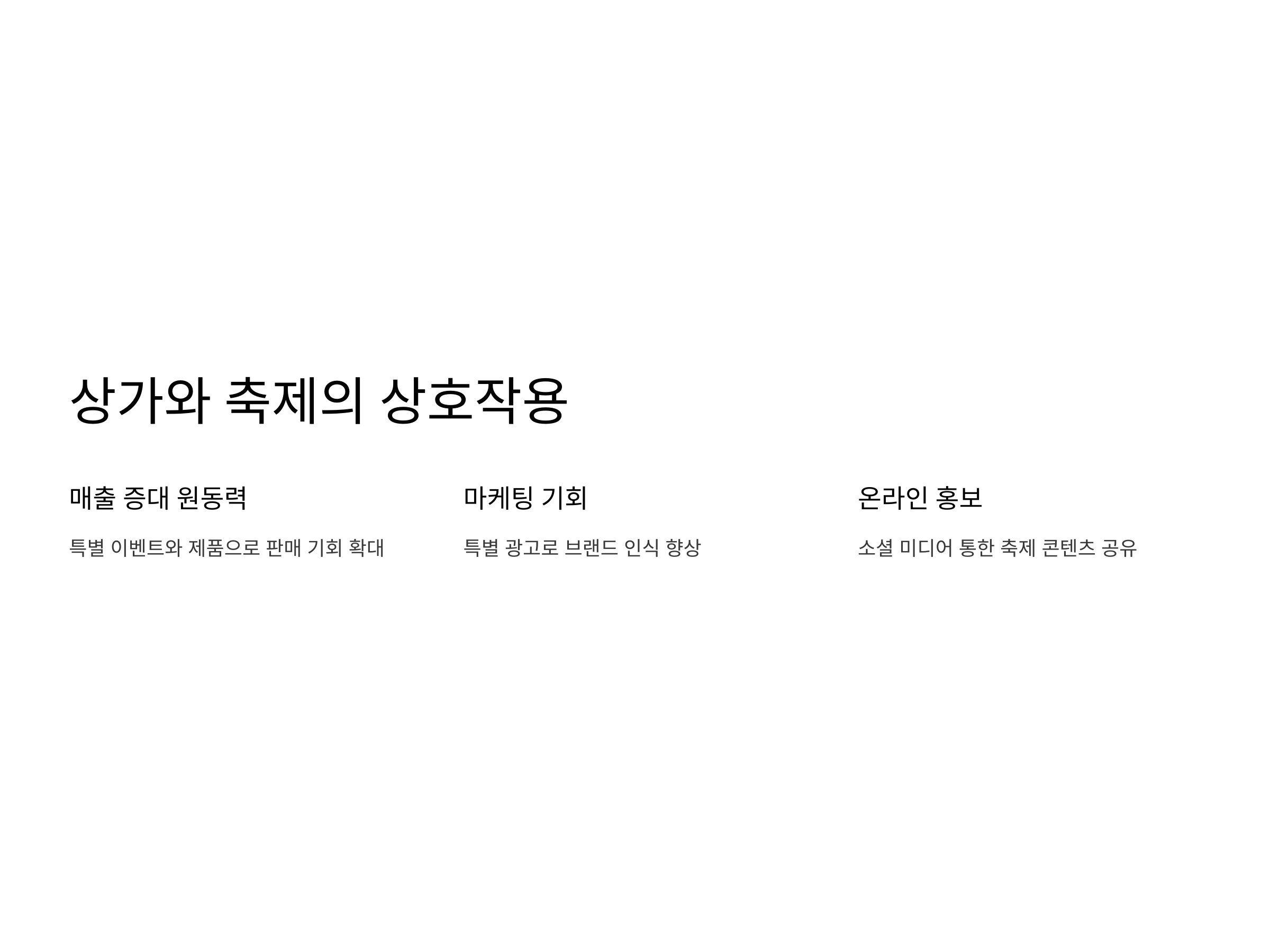셋째, 축제는 지역 상권의 장기적인 활성화에 기여할 수 있습니다. 축제의 성공적인 진행은 지역 주민들에게 상가가 활발히 운영되고 있다는 인식을 심어주며, 이를 통해 지속적인 매출 상승을 기대할 수 있습니다.
