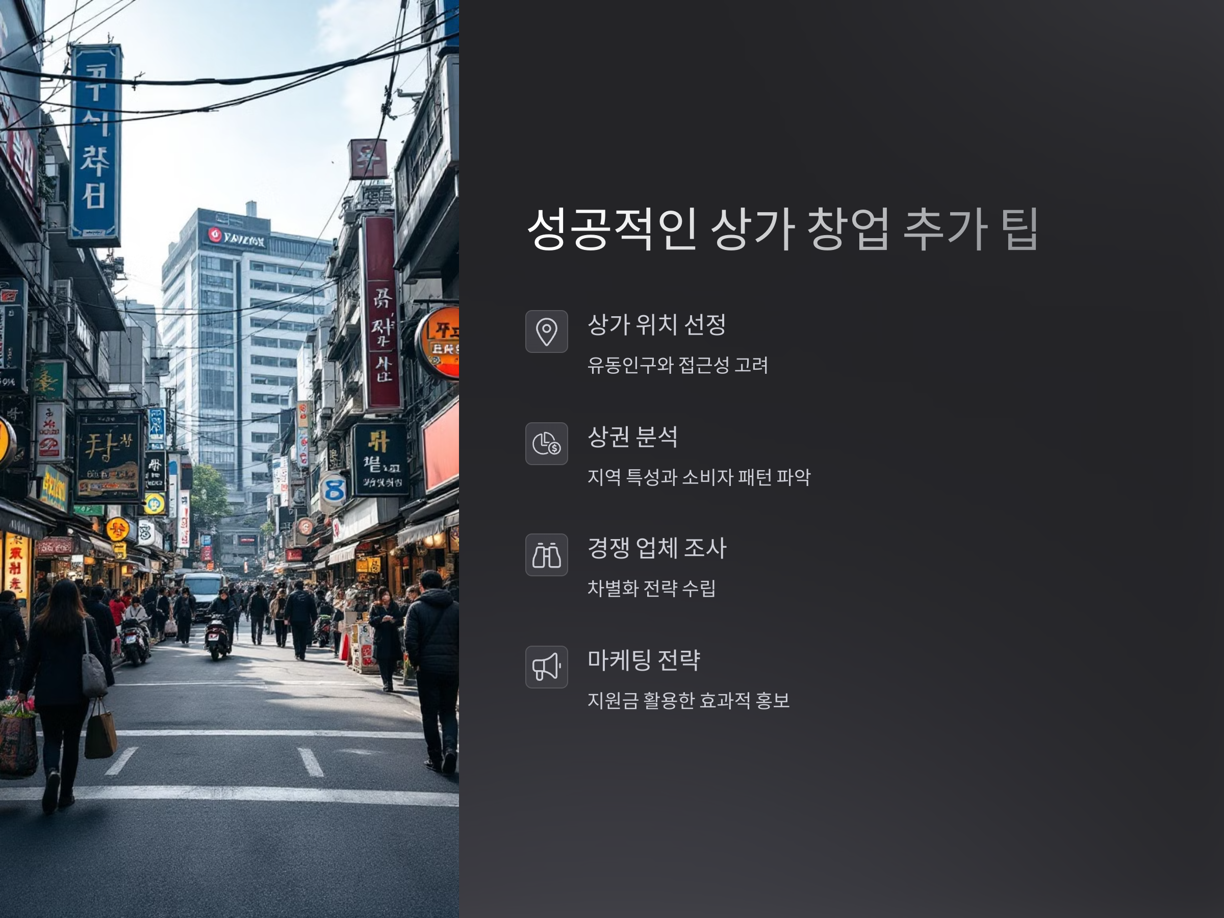 상가 창업에서 성공하기 위해서는 정부지원금을 잘 활용하는 것 외에도 창업자가 준비해야 할 여러 요소가 있습니다. 상가의 위치 선정, 상권 분석, 경쟁 업체 조사 등도 중요한 요소입니다. 창업자는 상가를 선택하기 전, 그 지역의 상권을 잘 분석하고, 경쟁 업체들의 활동을 면밀히 살펴봐야 합니다.