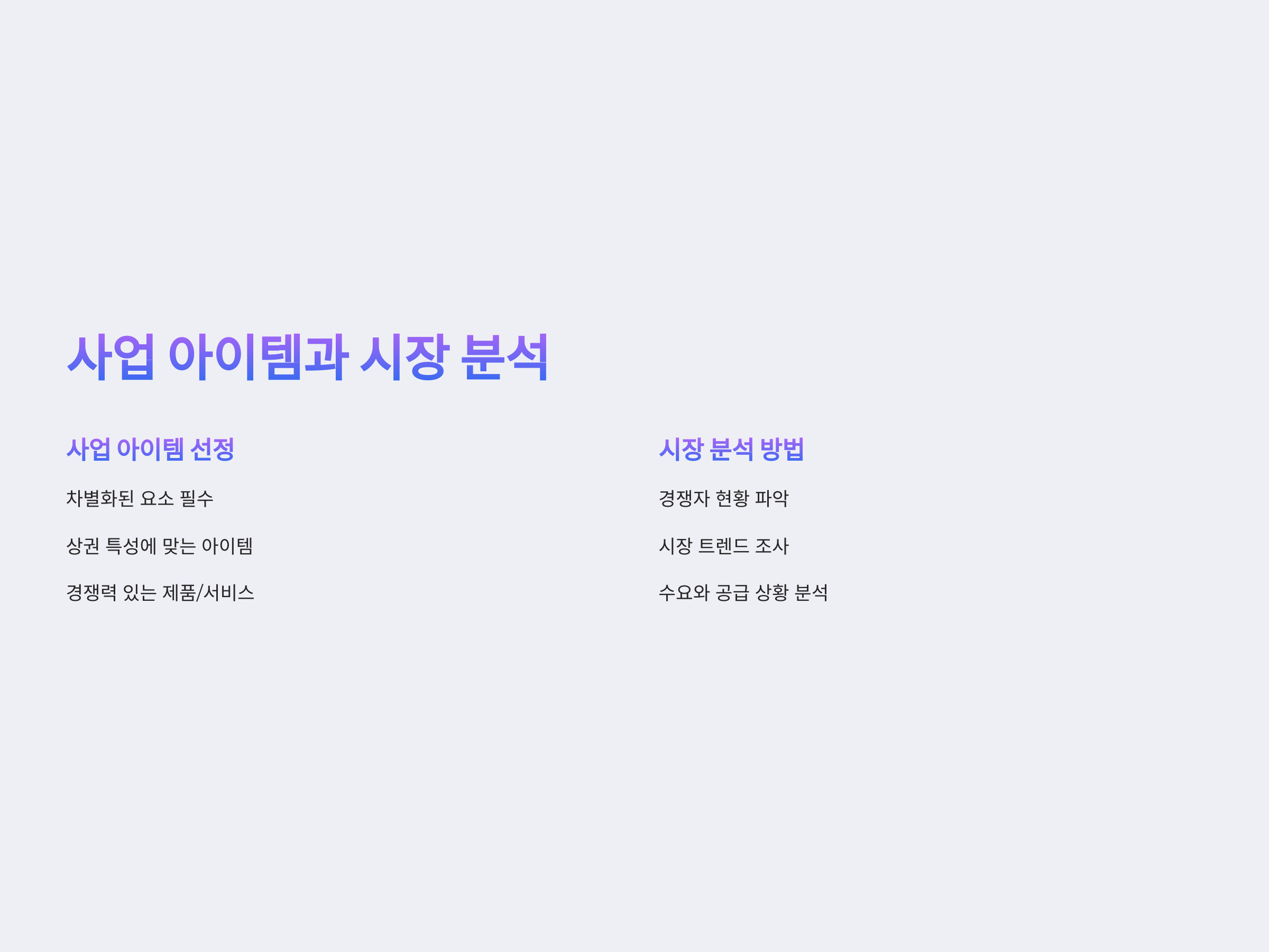 - 시장 분석: 대상 시장, 경쟁자 분석, 트렌드 등을 포함하여 시장 상황을 분석합니다.