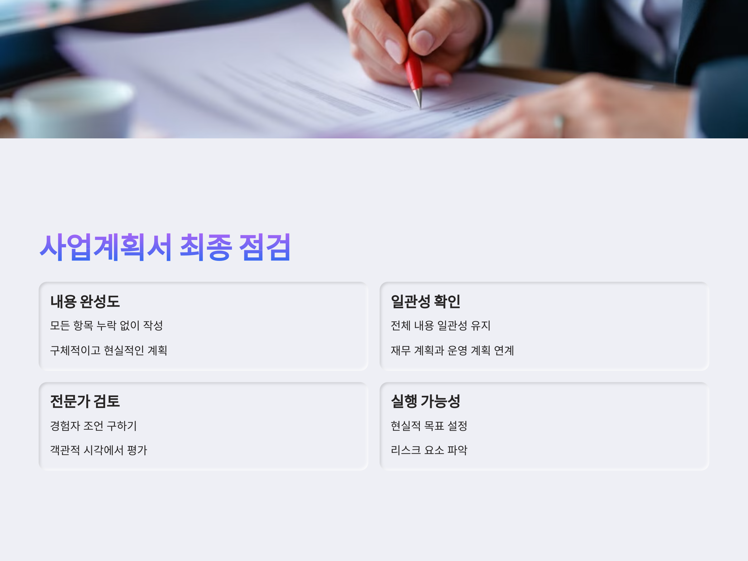 사업계획서는 작성 후 최종 점검이 필요합니다. 모든 항목이 명확하게 작성되었는지, 누락된 부분은 없는지 꼼꼼히 확인해야 합니다. 사업계획서가 완성되면 투자자나 금융기관에 제출하여 자금을 조달하고, 사업을 시작할 수 있습니다.