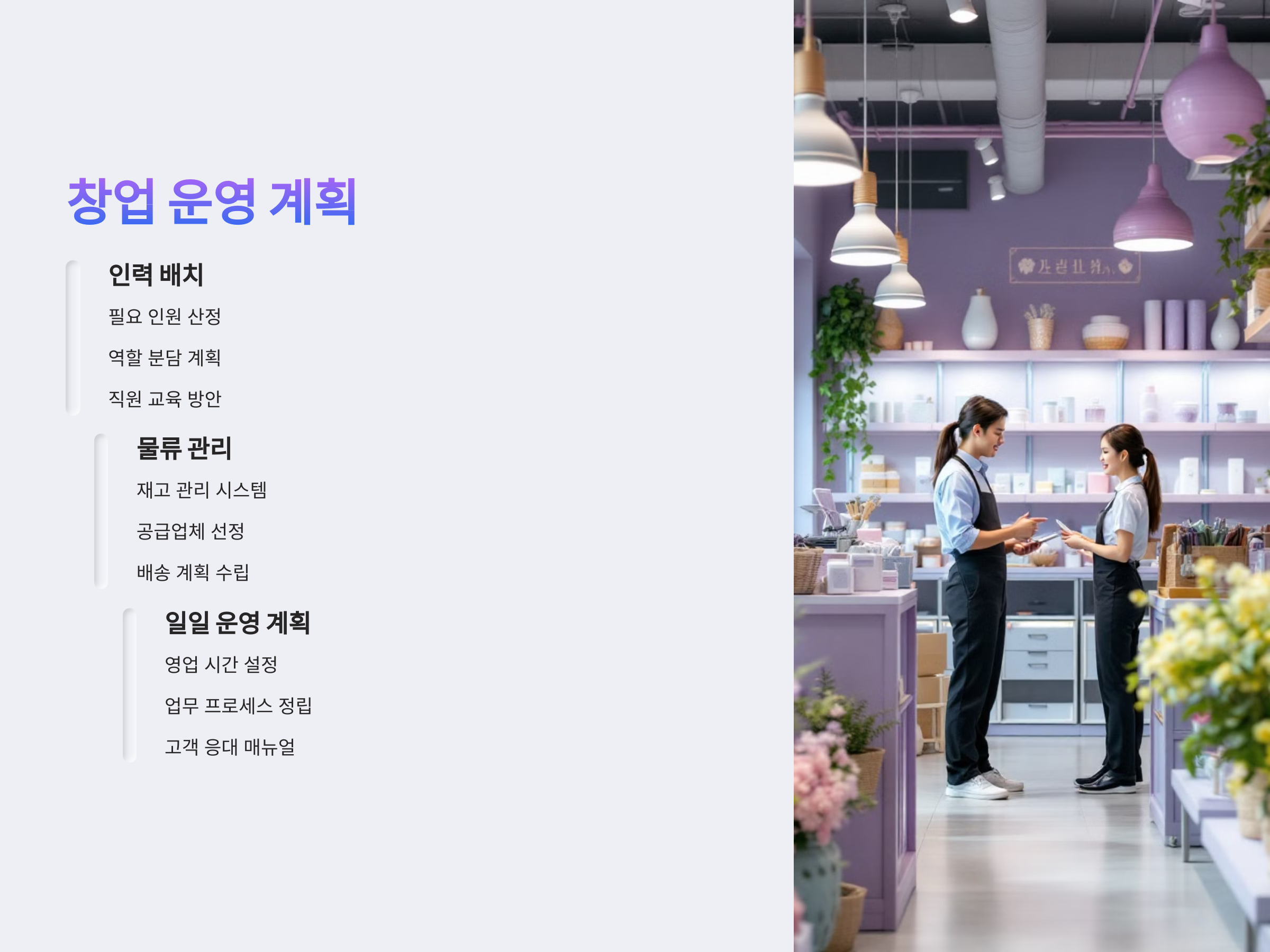 - 운영 계획: 상가 운영에 대한 실질적인 계획을 세웁니다. 인력 배치, 물류, 공급망 관리 등을 포함합니다.