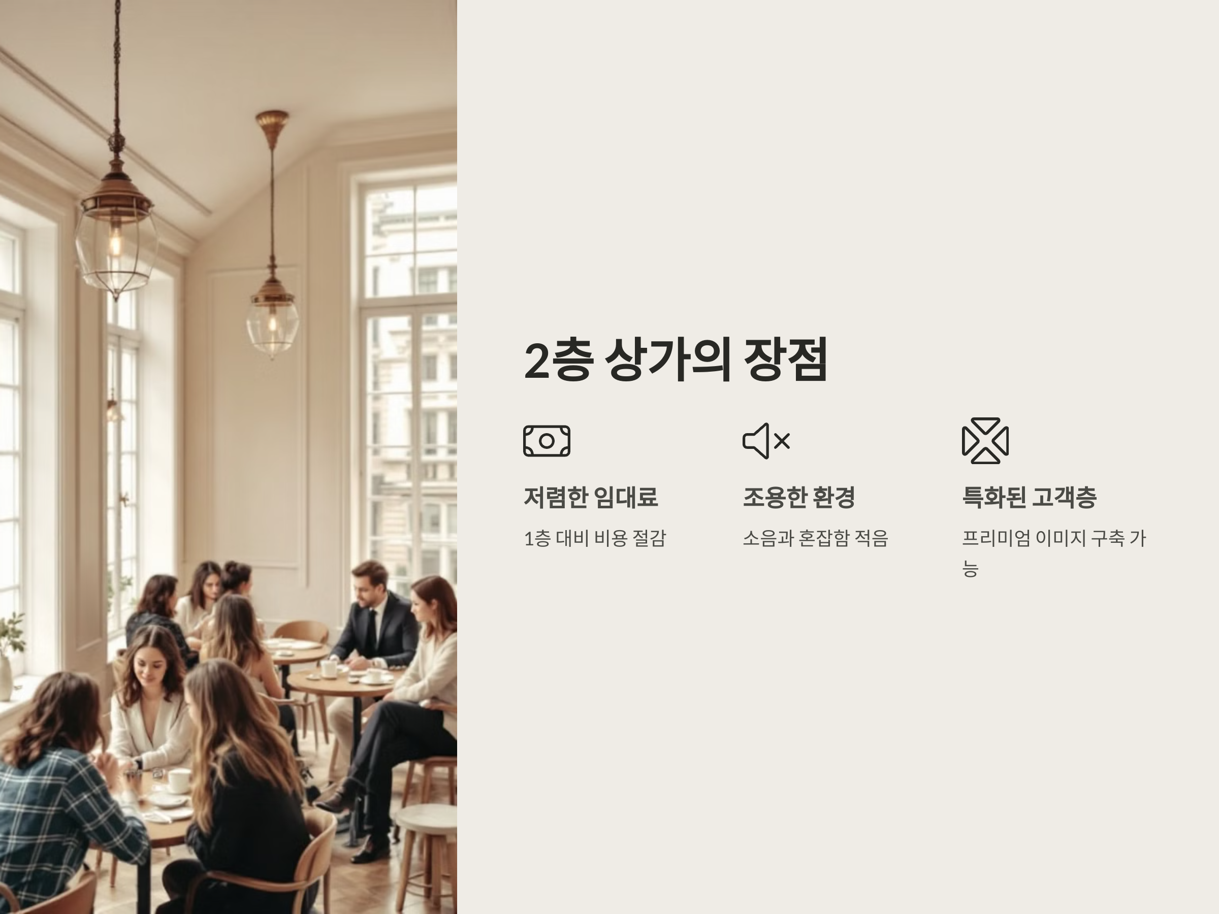 또한, 2층 상가는 "특화된 고객층"을 타겟팅할 수 있는 장점도 있습니다. 예를 들어, 2층에 위치한 특수 매장이나 카페는 일반적인 사람들의 접근이 어려워, 오히려 "프리미엄" 또는 "차별화된" 이미지를 제공할 수 있습니다. 또한, 간판이나 광고 효과가 떨어질 수 있지만, 독특한 매장을 찾는 고객들이 더 많이 유입될 가능성이 큽니다.