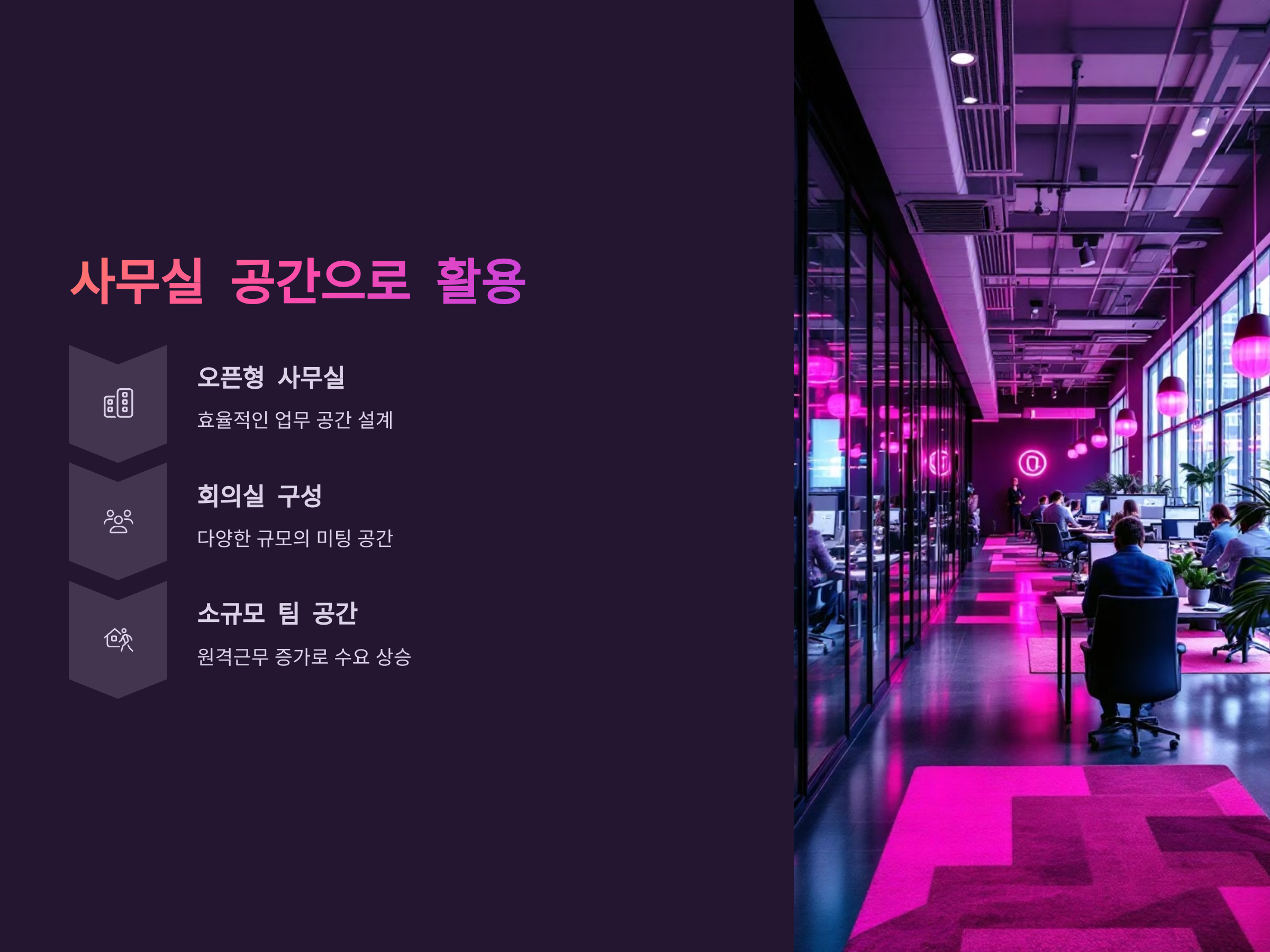 사무실 공간은 효율성을 고려하여 설계할 수 있으며, 창고나 작은 회의실 등을 추가하여 여러 사람을 위한 업무 공간을 제공할 수 있습니다. 특히 최근에는 재택근무와 원격 근무가 늘어나면서 소규모의 팀 단위로 운영되는 사무실에 대한 수요가 증가하고 있기 때문에, 이런 형태의 공간으로 변환하는 것은 좋은 전략이 될 수 있습니다.
