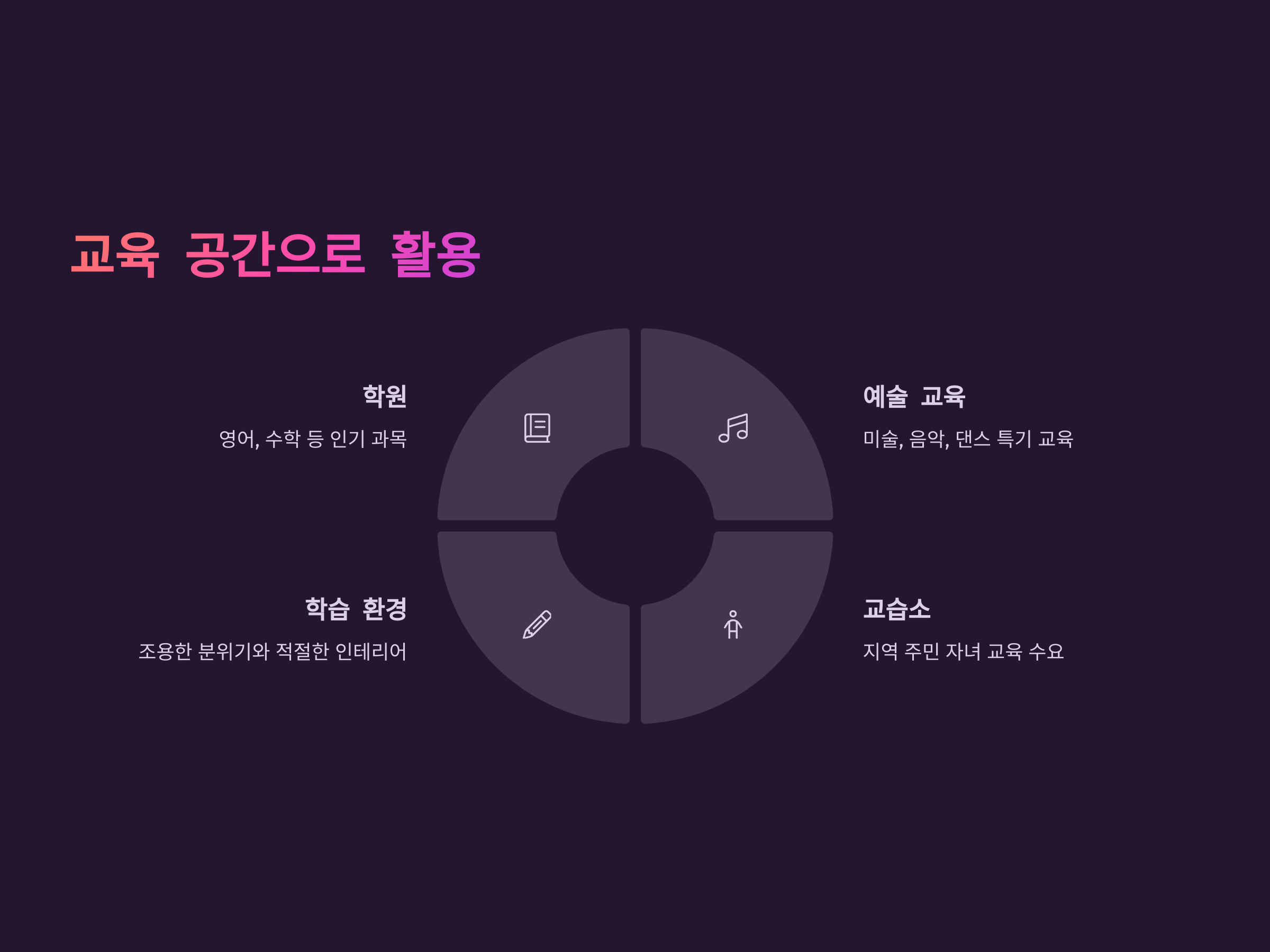 수요가 많은 영어, 수학 학원부터, 미술, 음악, 댄스와 같은 특기 교육까지 다양한 분야에 걸쳐 수요가 늘어나고 있습니다. 이 공간은 교육에 집중할 수 있는 환경을 조성할 수 있도록 조용한 분위기와 적절한 인테리어를 고려해 설계하는 것이 중요합니다.
