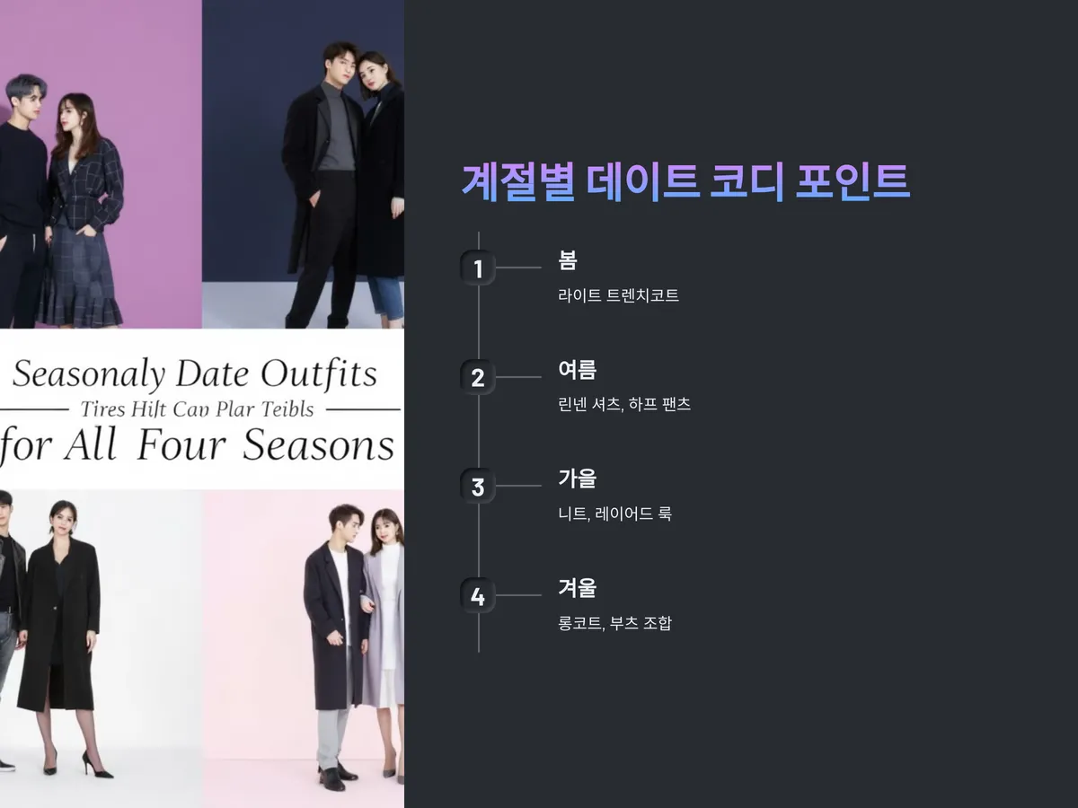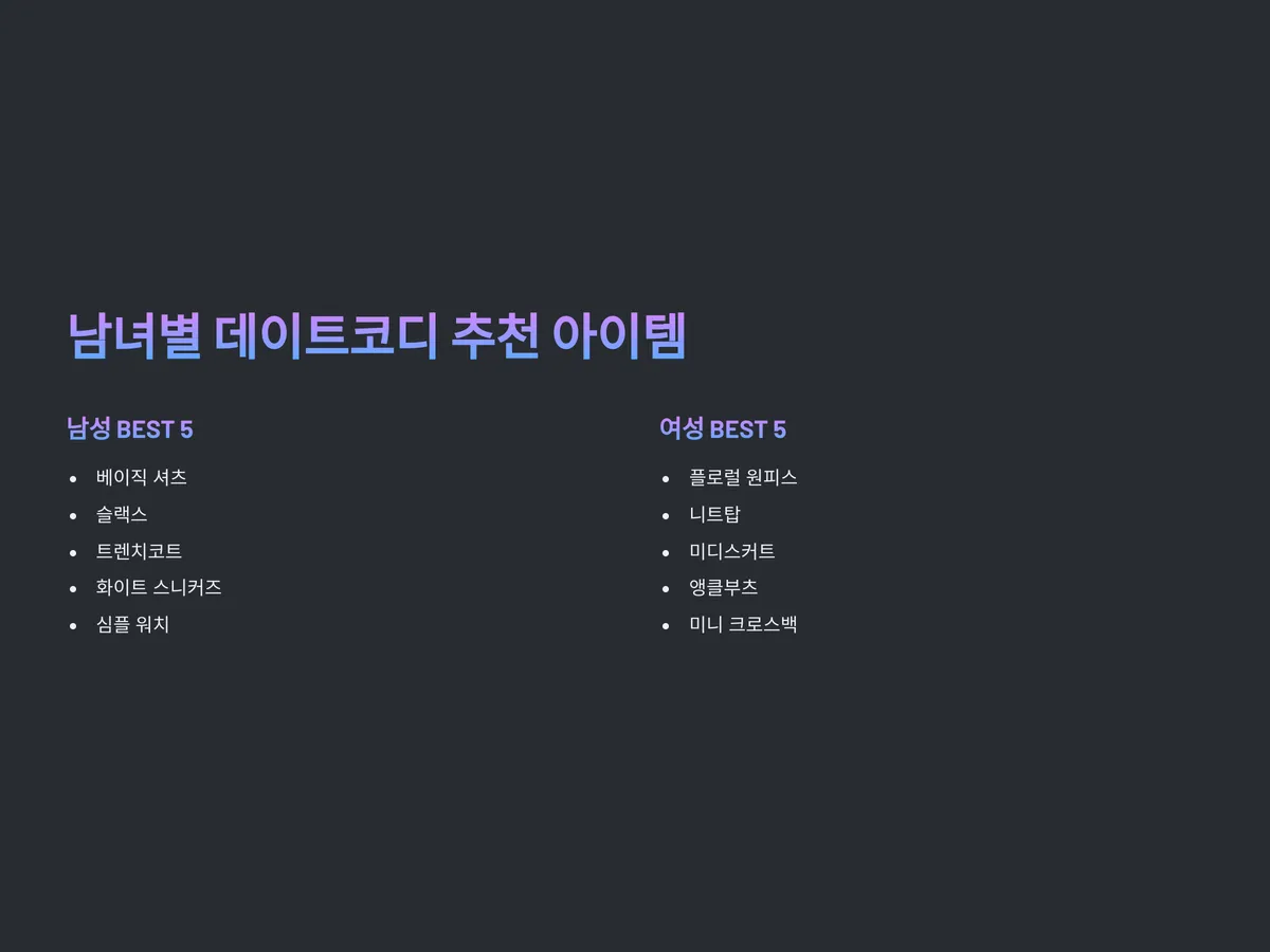 남성을 위한 추천 아이템은 베이직한 셔츠, 슬랙스, 트렌치코트, 화이트 스니커즈, 심플 워치이며, 여성은 플로럴 원피스, 니트탑, 미디스커트, 앵클부츠, 미니 크로스백이 인기입니다. 이 아이템들은 장소에 구애받지 않고 데이트 코디에 활용도가 높으며, 분위기를 자연스럽게 업그레이드 해줍니다.