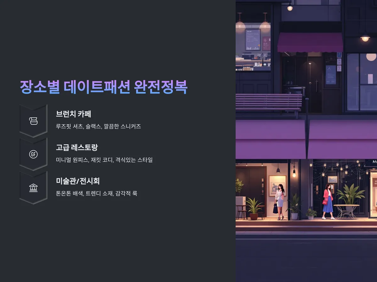 데이트 장소에 따라 추천 코디는 천차만별입니다. 캐주얼한 브런치 카페에서는 루즈핏 셔츠에 슬랙스, 깔끔한 스니커즈로 댄디한 느낌을 연출하는 것이 좋고, 고급 레스토랑에서는 미니멀한 원피스나 재킷 코디로 격식을 갖춘 스타일링이 필요합니다. 반면 미술관이나 전시회 데이트에서는 톤온톤 배색이나 트렌디한 소재를 활용한 감각적인 룩이 인상적입니다.